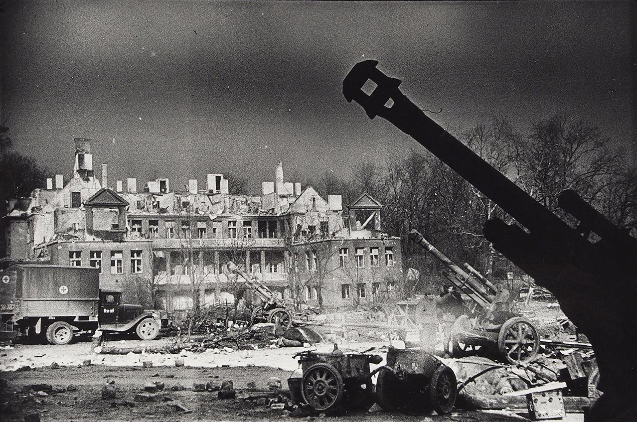 Разбитая немецкая батарея 105-мм полевых гаубиц leFH 18/40 (10,5cm leFH 18/40) в Кенигсберге. Слева стоит советский санитарный грузовик Газ-АА. Предположительно, на другом фото запечатлено орудие из этой же батареи. Полуразрушенное здание на снимке — ныне общежитие Калининградского филиала Санкт-Петербургского университета МВД России (ул. Генерала Галицкого, 28, Ленинградский район, Калиниград).