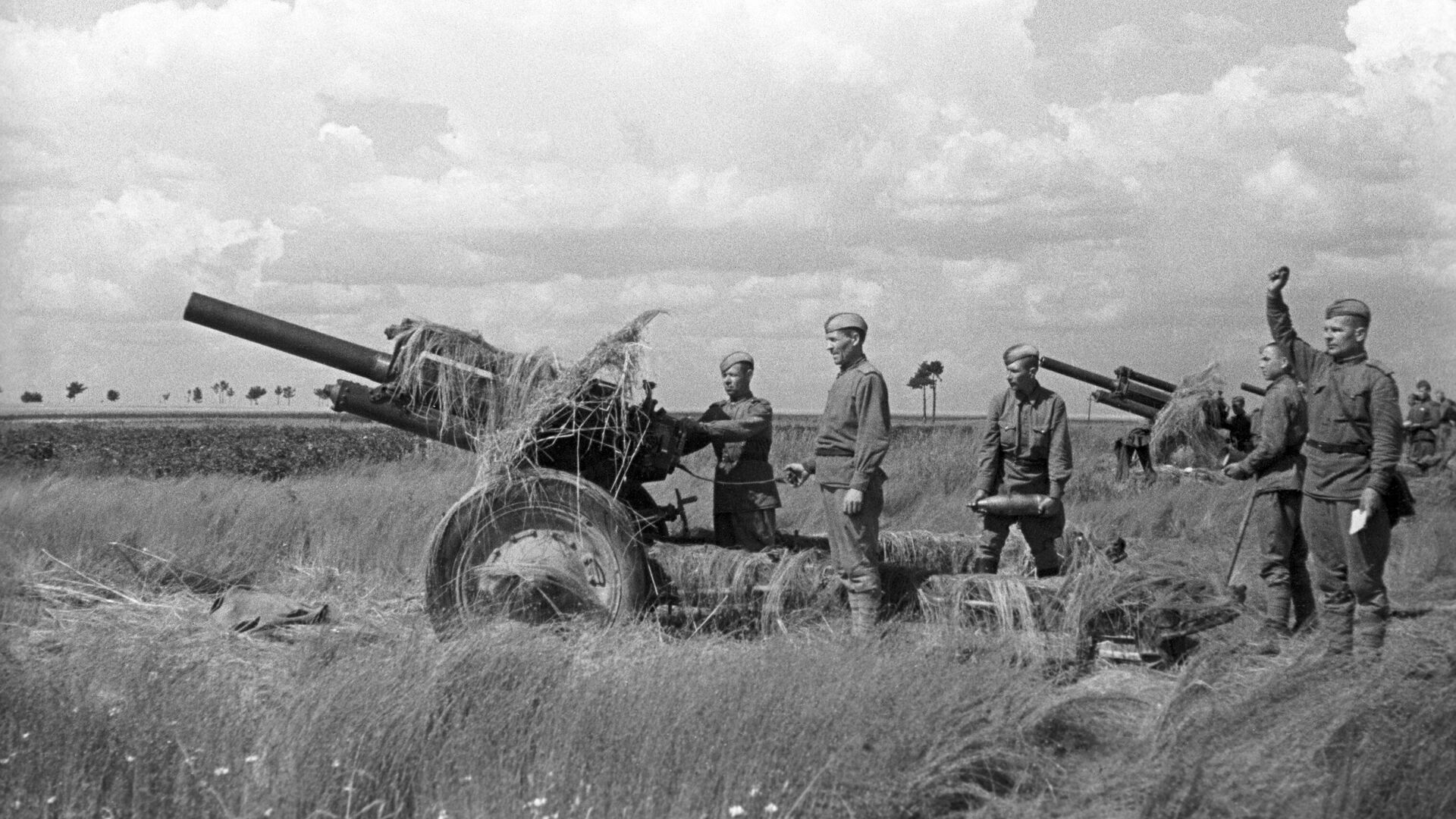 Батарея советских гаубиц М-30 старшего лейтенанта Осипова ведет огонь в Минской области