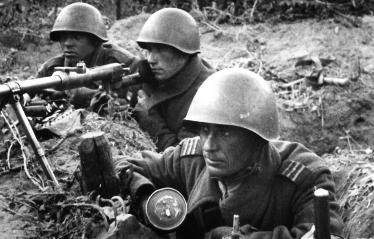 Расчет советских бронебойщиков с противотанковым однозарядным ружьем системы Дегтярева образца 1941 года (ПТРД-41) в окопе в полной боевой готовности. На переднем плане сержант приготовился бросить гранату РГД-41 (ручная граната Дьяконова образца 1941 года).