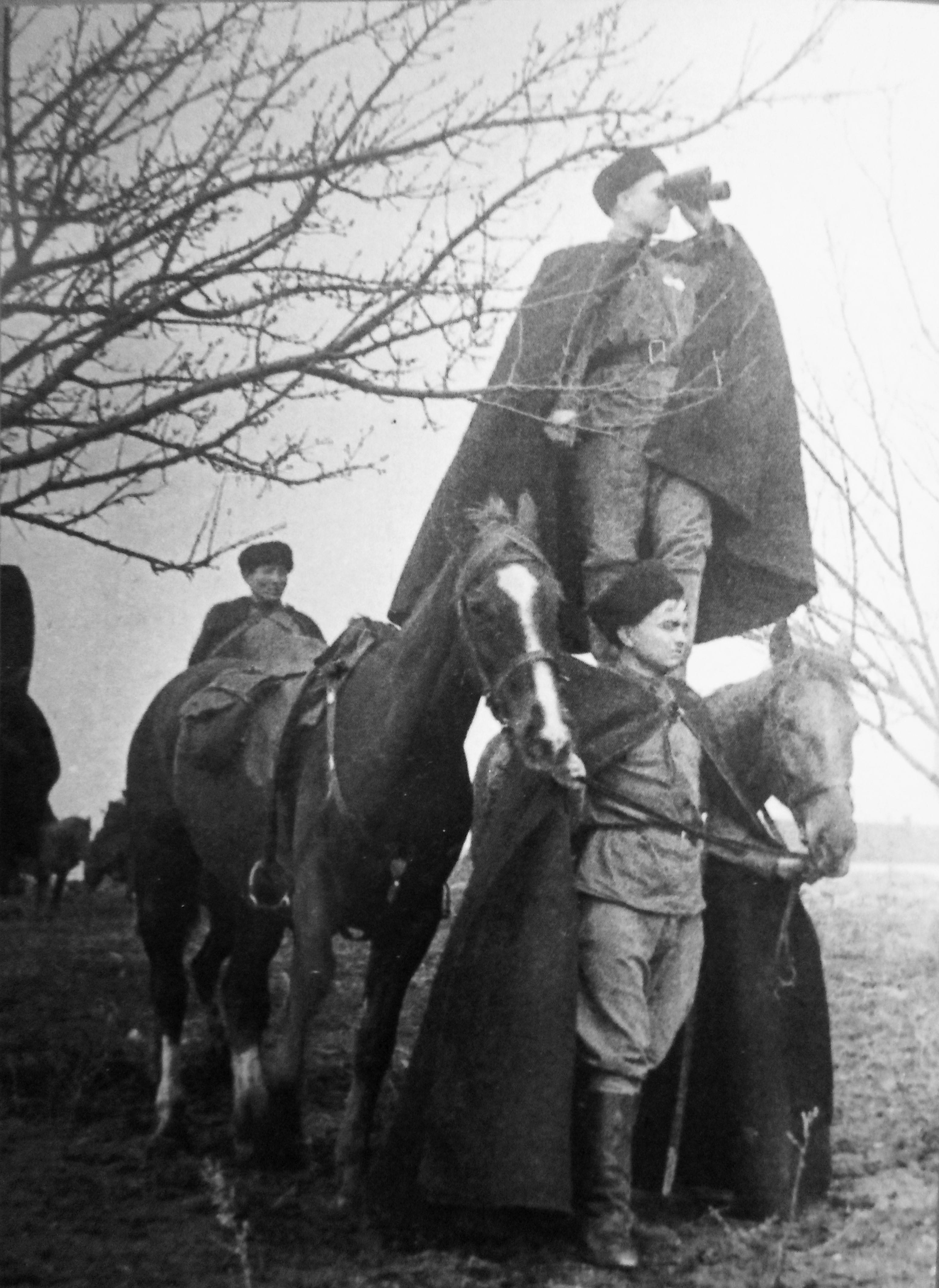 Разъезд разведчиков взвода разведки 40-го гвардейского Кубанского казачьего кавалерийского полка 10-й гвардейской Кубанской казачьей кавалерийской дивизии 4-го гвардейского Кубанского казачьего кавалерийского корпуса в составе гвардии младшего сержанта Анатолия Павловича Чернопольского (9.03.1924 — 10.09.2000), гвардии старшего сержанта В.В. Носкова и гвардии ефрейтора Алипа Жакеевича Кумарова (1916 г.р.), ведет наблюдение.