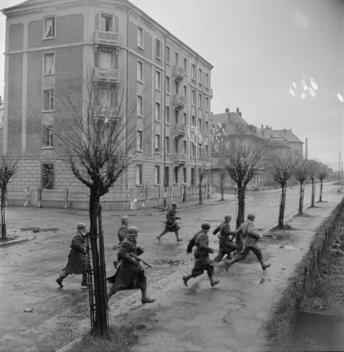 Французские солдаты 6-го марокканского тиральерского полка (6e régiment de tirailleurs marocains, 6e RTM) перебегают через улицу во время боев в северных предместьях Мюлуза (Mulhouse).