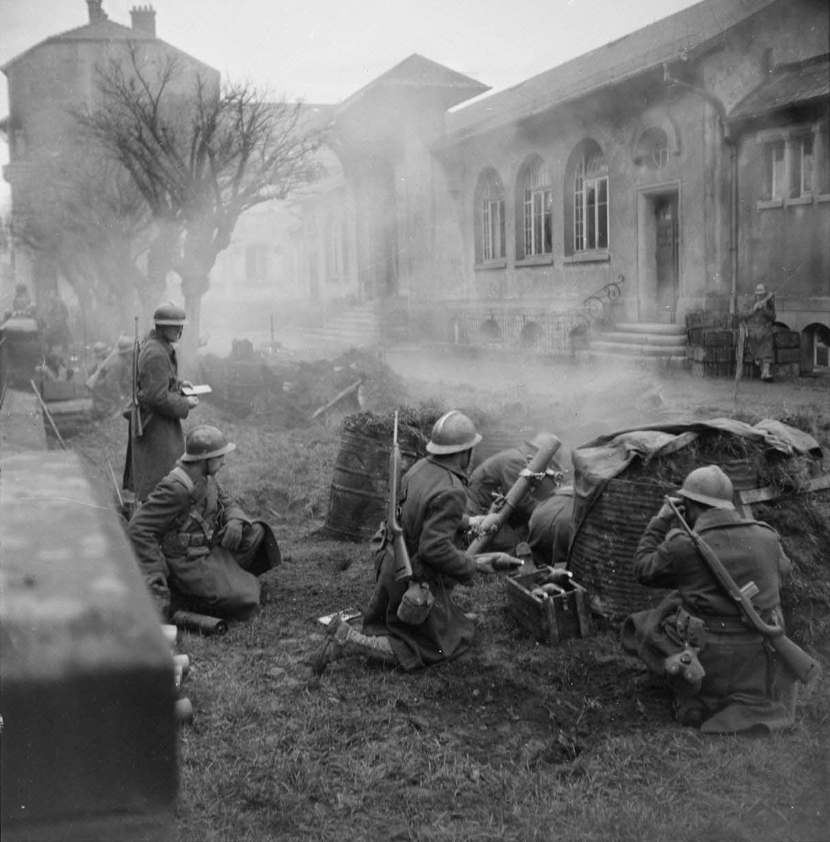 Французские расчеты 81-мм минометов обстреливают казармы в Мюлузе (Mulhouse), в которых укрываются немецкие солдаты. Солдаты вооружены американскими карабинами М1.