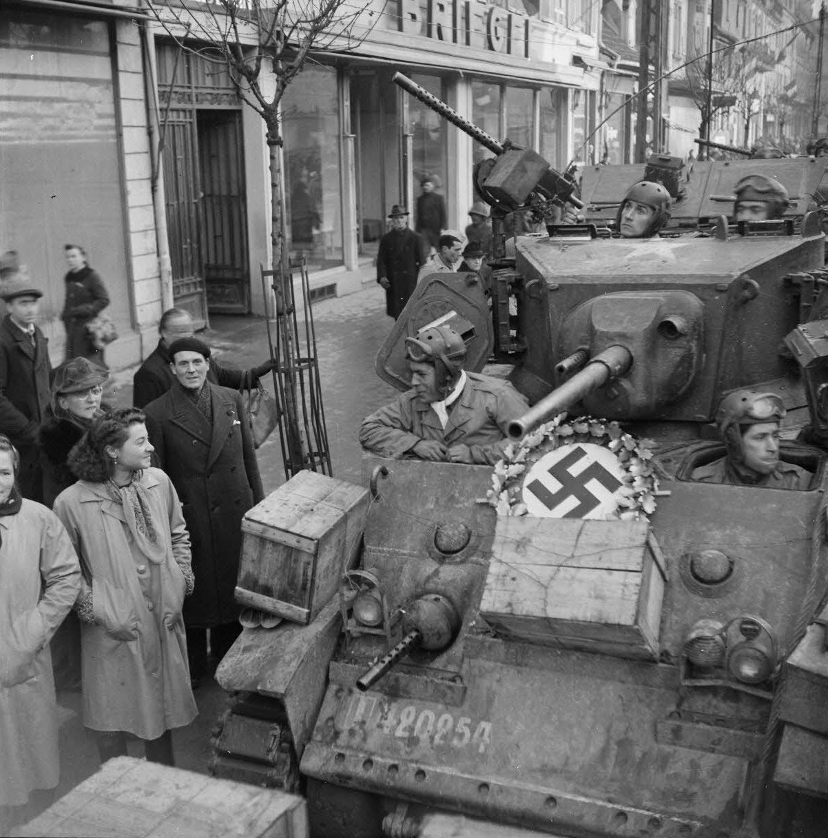 Французский легкий танк «Стюарт» (M3 Stuart) 3-го боевого командования 1-й бронетанковой дивизии (Combat Command №3, CC3; 1re division blindée, 1re DB) на улице освобожденного Мюлуза (Mulhouse).