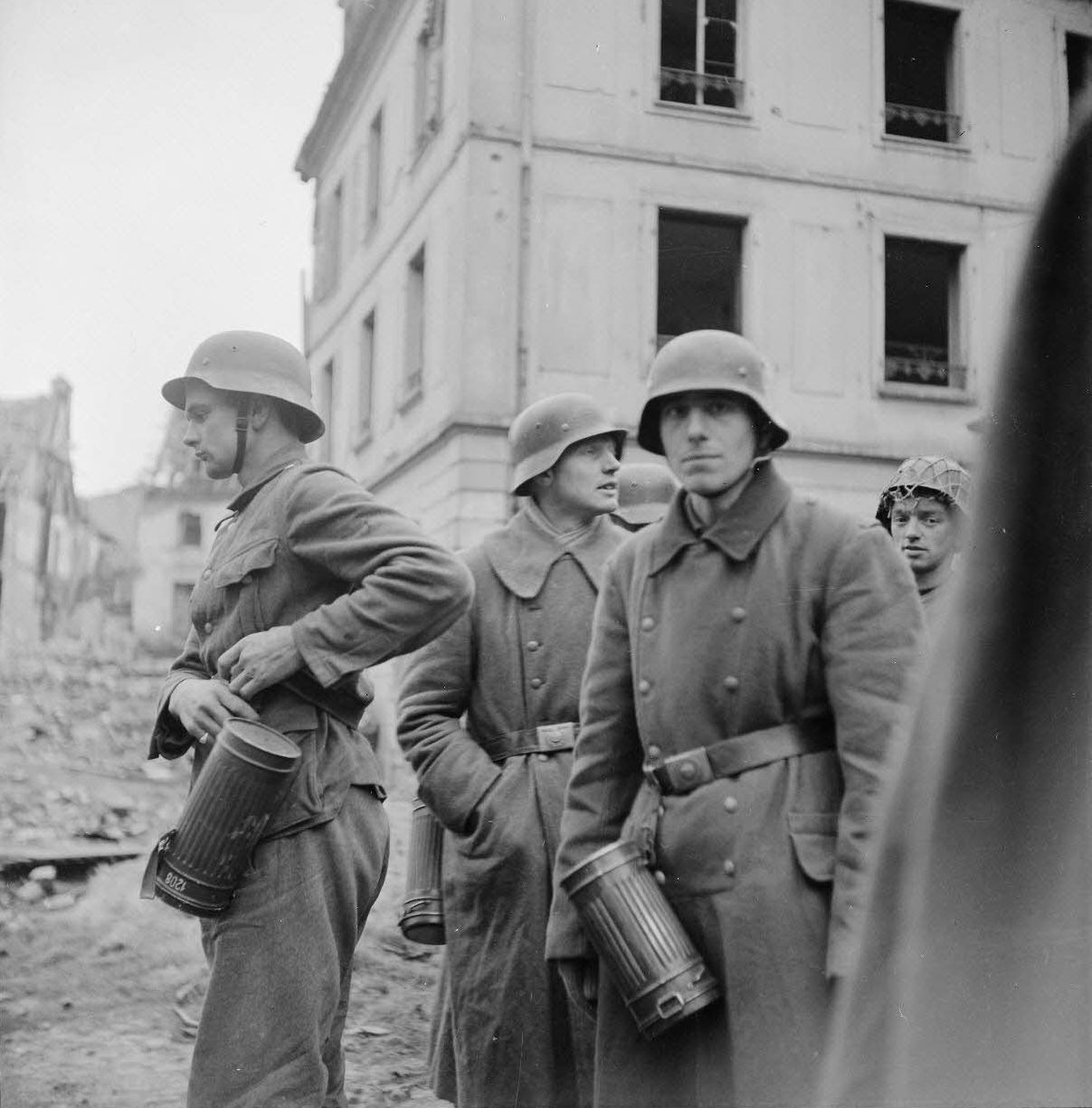Немецкие солдаты, укрывавшиеся в казармах «Лефевр» в Мюлузе (Mulhouse), сдаются французским войскам.