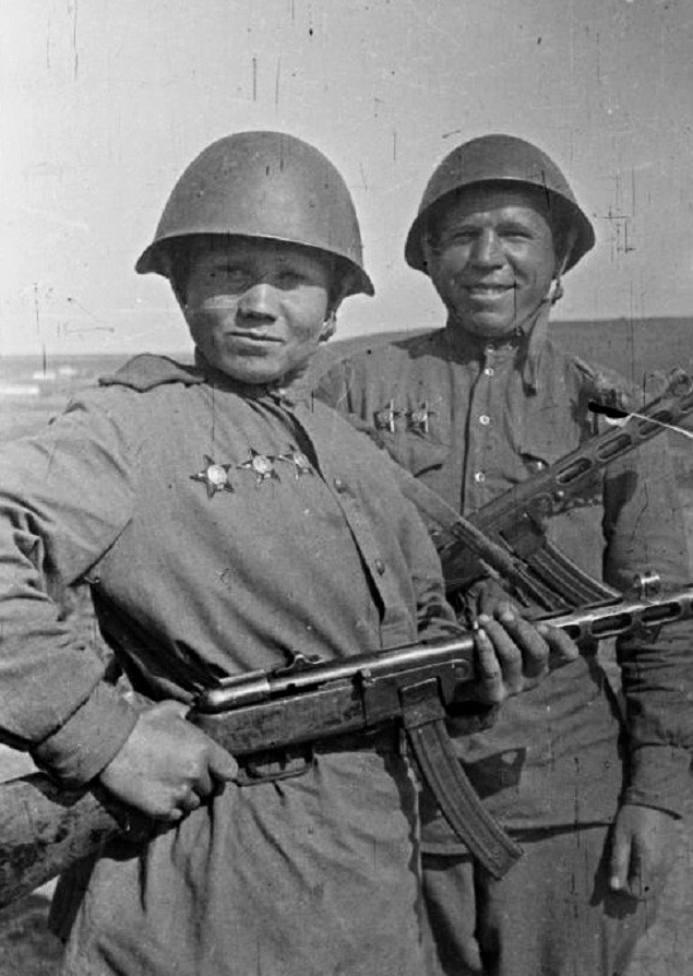 Лучшие бойцы моторизованного батальона автоматчиков 36-й гвардейской танковой бригады 4-го гвардейского механизированного корпуса 3-го Украинского фронта автоматчик гвардии рядовой Евсей Иванович Ившин (1925 — 2006 г.р., первый слева), награжденный тремя орденами Красной Звезды и командир отделения гвардии старший сержант Иван Авдеевич Лескин (1916 г.р., второй слева), награжденный двумя орденами Красной Звезды, с боевыми товарищами.