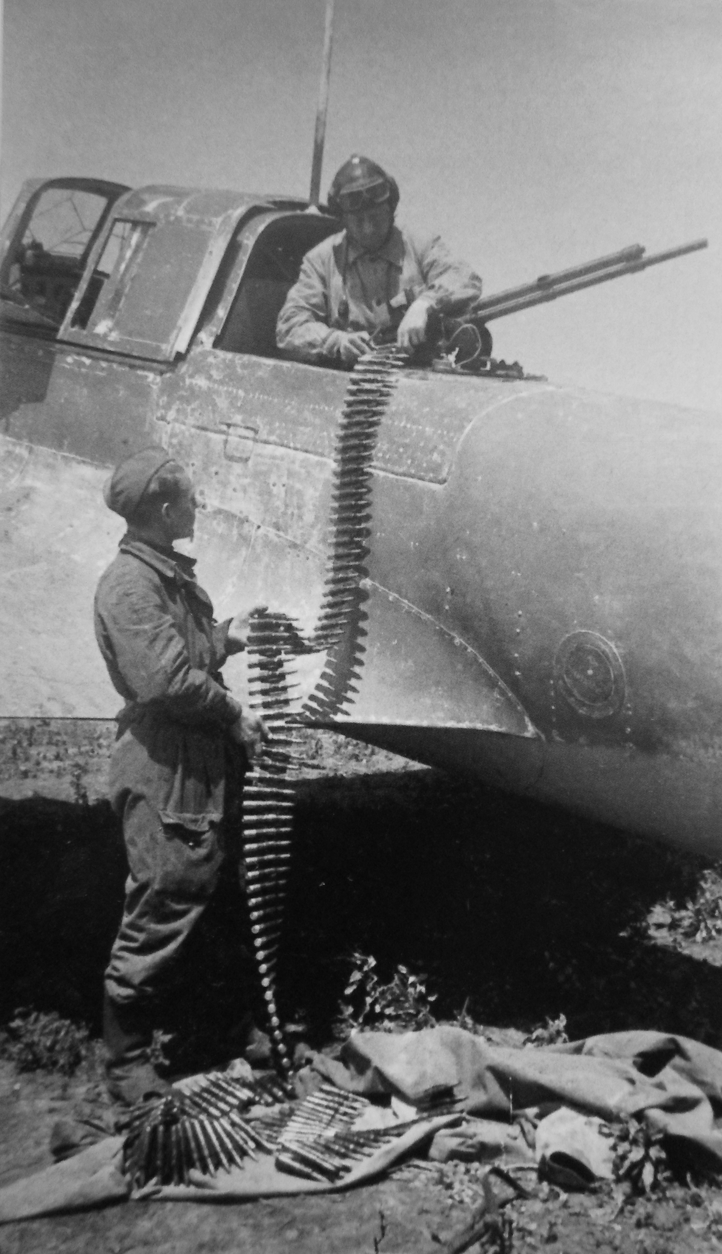 Красноармеец П. Христофоров (в кабине) и сержант И. Моисеев снаряжают 12,7-мм пулемет УБТ самолета Ил-2 109-го гвардейского штурмового авиационного полка 6-й гвардейской штурмовой авиационной дивизии 1-го гвардейского смешанного авиационного корпуса 17-й воздушной армии 3-го Украинского фронта.