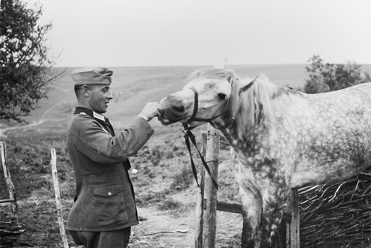 Обер-лейтенант 167-й пехотной дивизии вермахта угощает лошадь хлебом. Обер-лейтенант есть и на другом снимке.