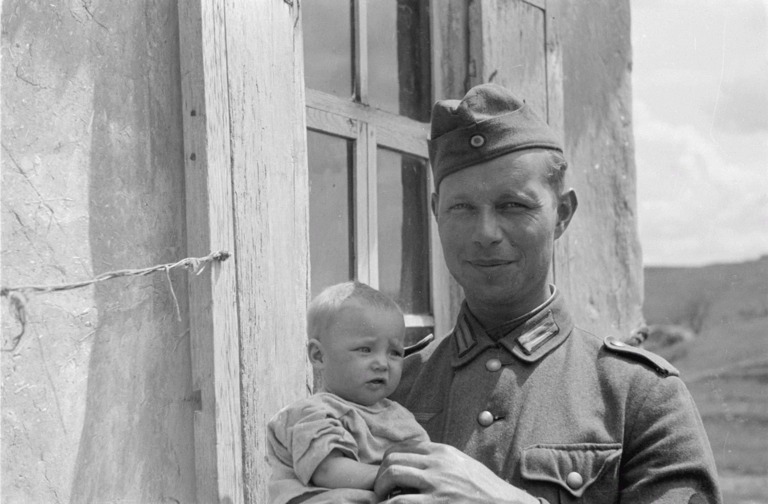 Рядовой вермахта Франц Грассер (Franz Grasser, 26.03.1911 — 13.11.1944) с ребенком на руках. На момент съемки служил в 167-й пехотной дивизии, приданной панцер-гренадерской дивизии СС «Дас Райх» (Panzer-Grenadier-Division Das Reich). Автор многих пейзажных и портретных фотографий, сделанных в войну в Советском Союзе. До войны Франц Грассер работал профессиональным фотографом в Мюнхене. Попал в плен в ходе Ясско-Кишиневской операции в августе 44-го, умер в плену под Новороссийском.
