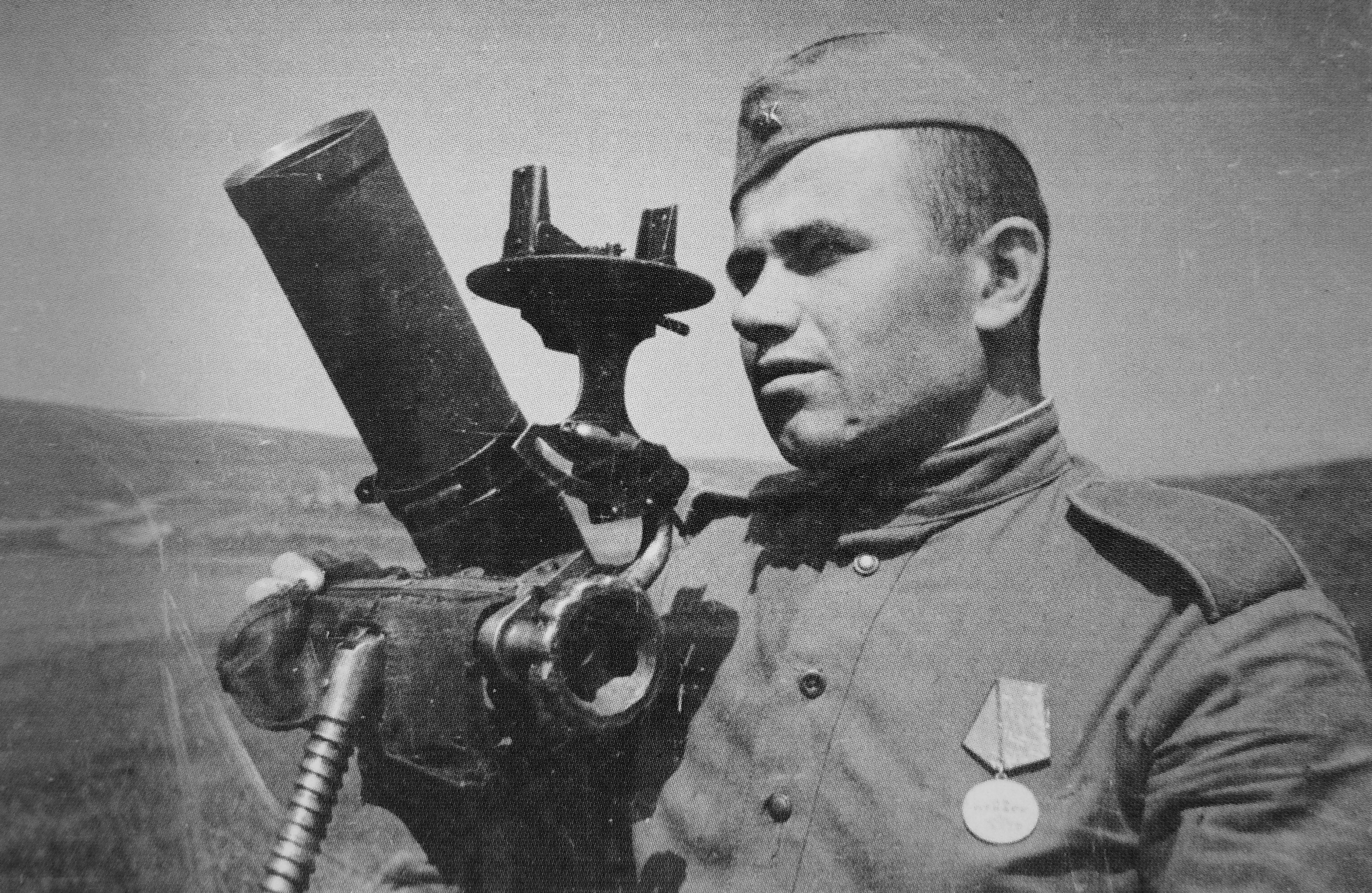 Наводчик миномета мотострелково-пулеметного батальона 36-й гвардейской танковой бригады 4-го гвардейского механизированного корпуса 3-го Украинского фронта гвардии красноармеец Василий Фокович Кобицкий (1911 г.р.), награжденный орденом Красной Звезды и медалью «За отвагу», у 82-мм батальонного миномета.