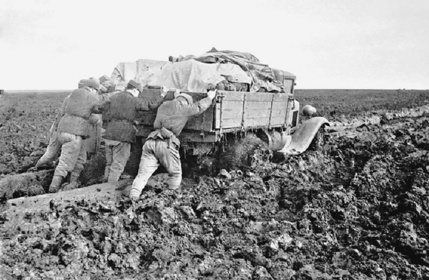 Советские солдаты толкают грузовик ЗиС-5 с боеприпасами, буксующий в грязи