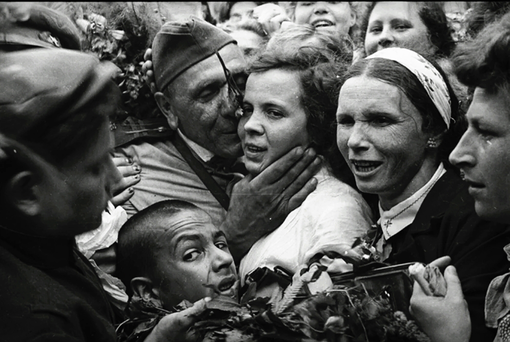Родные встречают фронтовика на Белорусском вокзале в Москве.