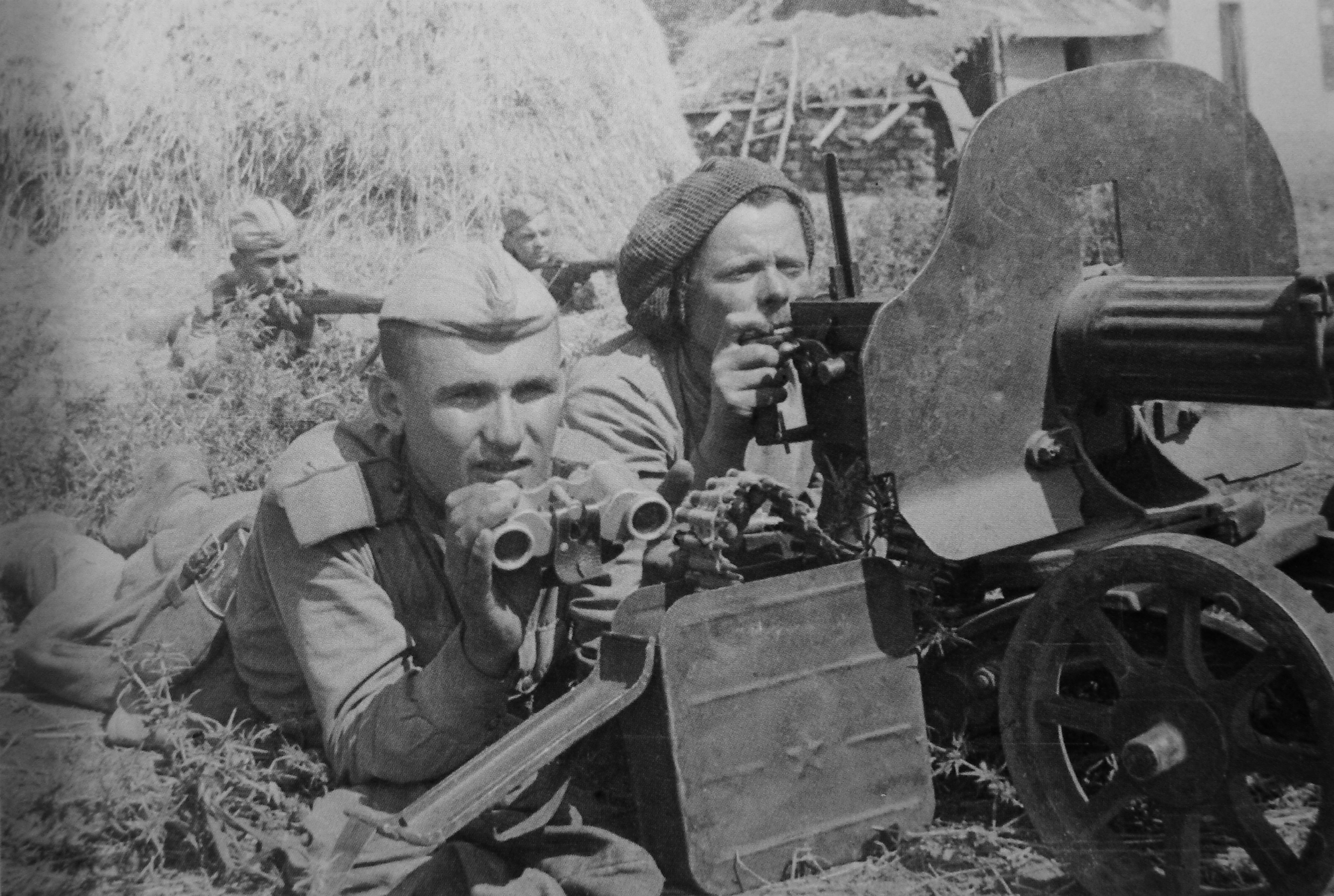 Расчет станкового пулемета «Максим» командира отделения пулеметной роты 3-го мотострелкового батальона 15-й гвардейской механизированной бригады 4-го гвардейского механизированного корпуса 3-го Украинского фронта гвардии сержанта Максима Леонтьевича Кирющенко (Кирющенкова, 1902 — 10.12.1944) и помощника наводчика пулемета гвардии младшего сержанта Алексея Ивановича Липка (1924 г.р.) на огневой позиции.