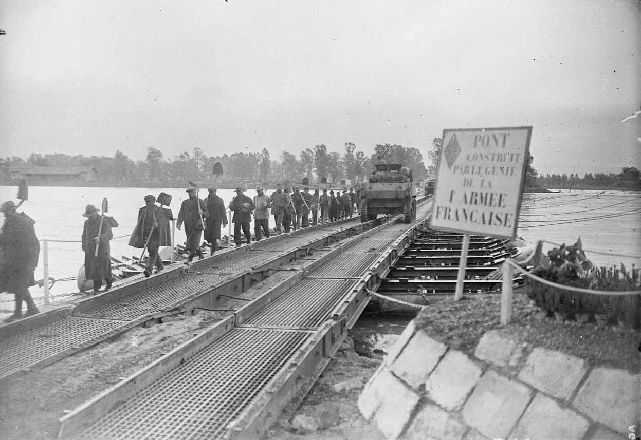 Немецкие мирные жители переходят Рейн по понтонному мосту, наведенному инженерно-саперными подразделениями 1-й армии в районе Бенайма (Beinheim), направляясь на работы по ремонту поврежденных танками дорог.