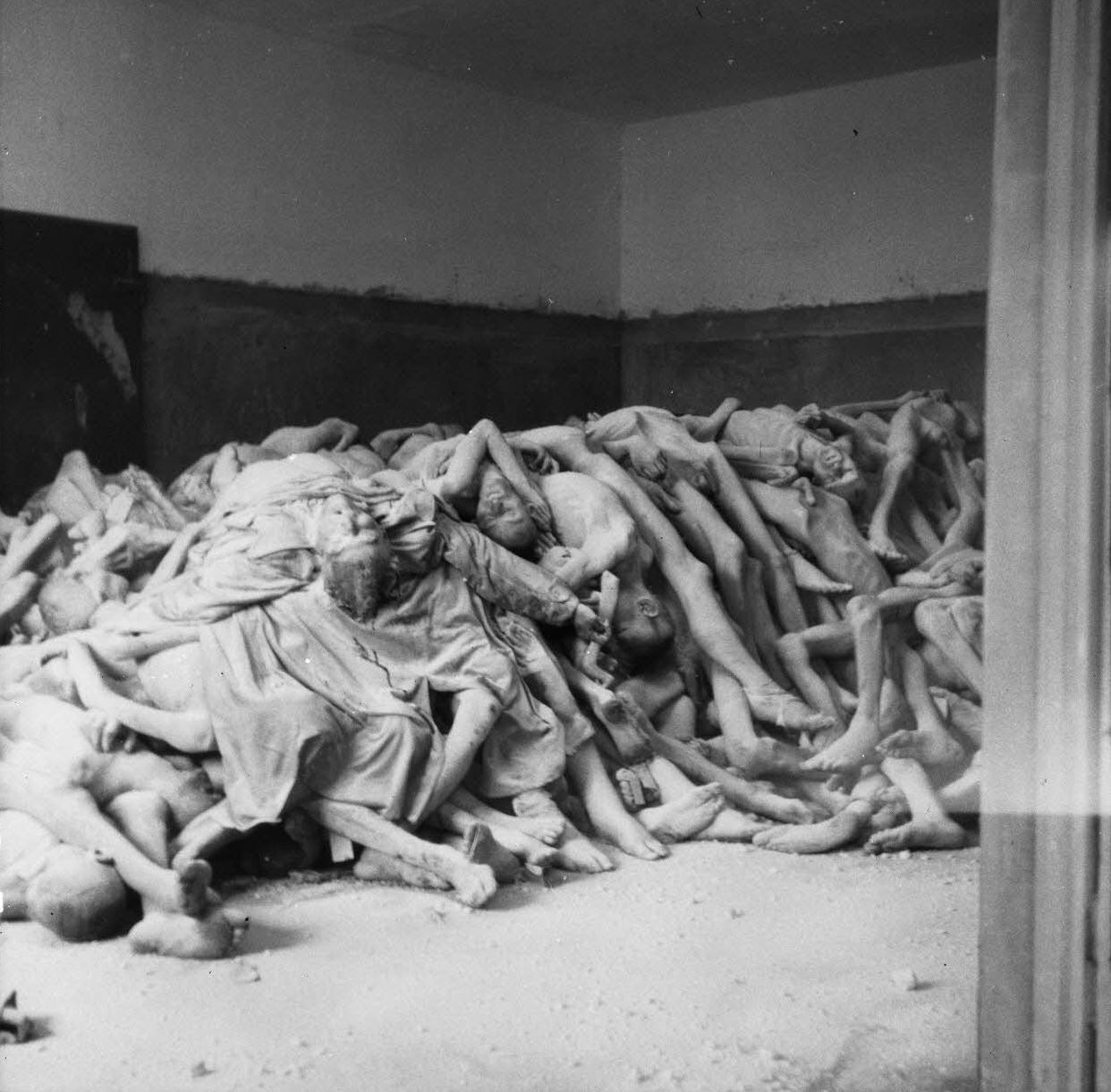 Груда трупов узников в помещении крематория концлагеря Дахау [3]