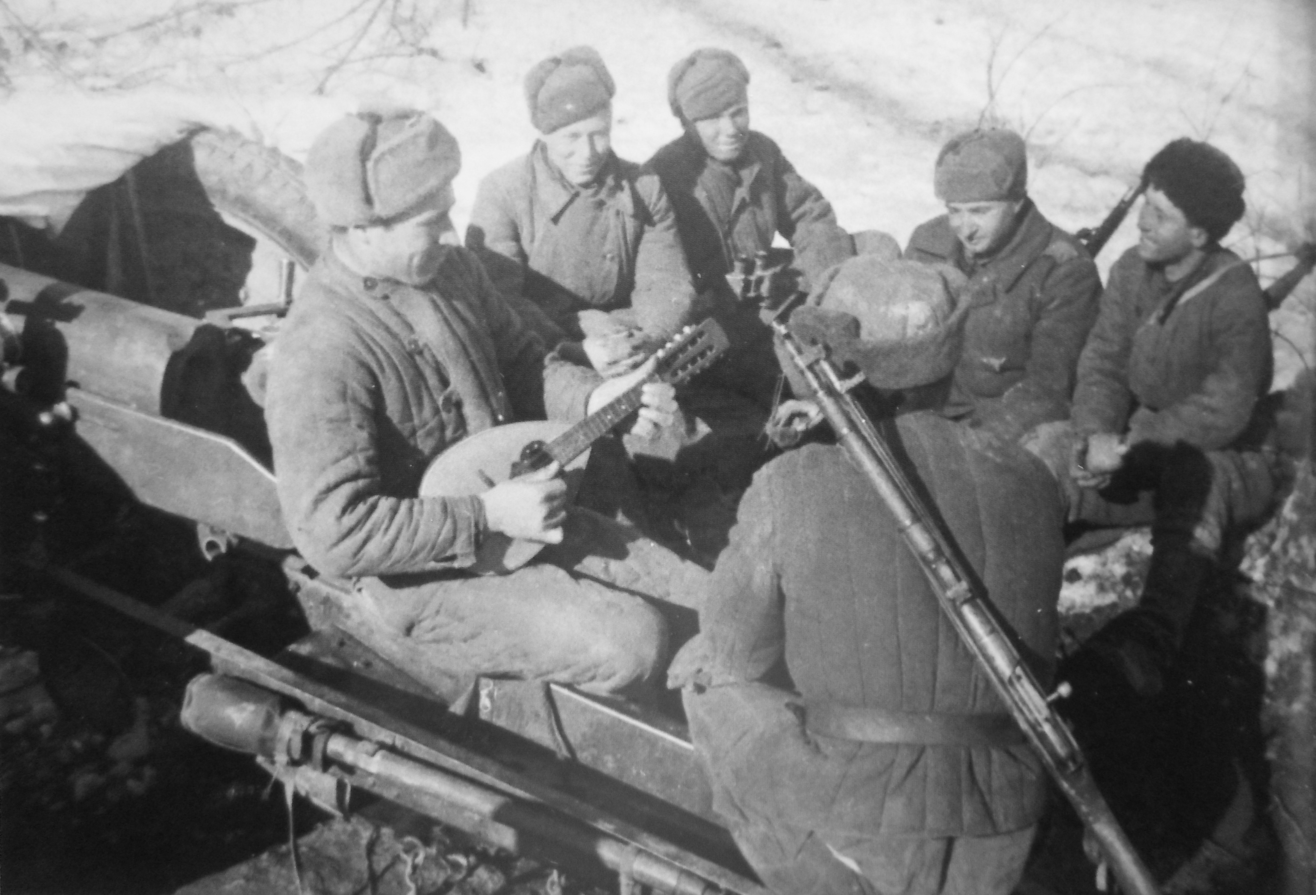 Расчет советской 76-мм пушки слушает товарища, играющего на мандолине [3]
