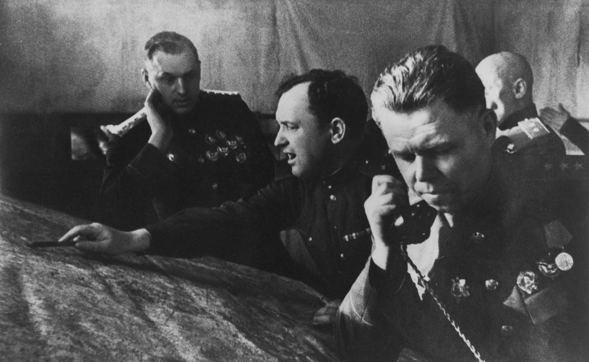 Командующий 1-м Белорусским фронтом генерал армии Константин Константинович Рокоссовский (1896—1968, на дальнем плане слева) на командном пункте. На втором плане справа — Член военного совета 1‑го Белорусского фронта генерал-лейтенант Константин Федорович Телегин (1899 — 1981). У карты с карандашом в руке – заместитель начальника штаба 1-го Белорусского фронта-начальник оперативного управления штаба фронта генерал-майор Иван Иванович Бойков (1900-1963).