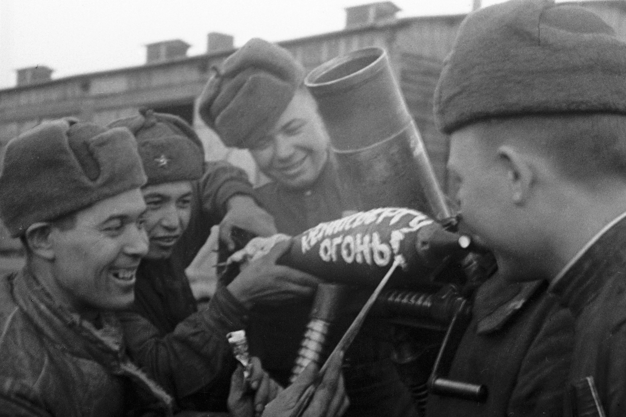 Боец расчета советского миномета ПМ-41 пишет на мине «По Кенигсбергу огонь!»