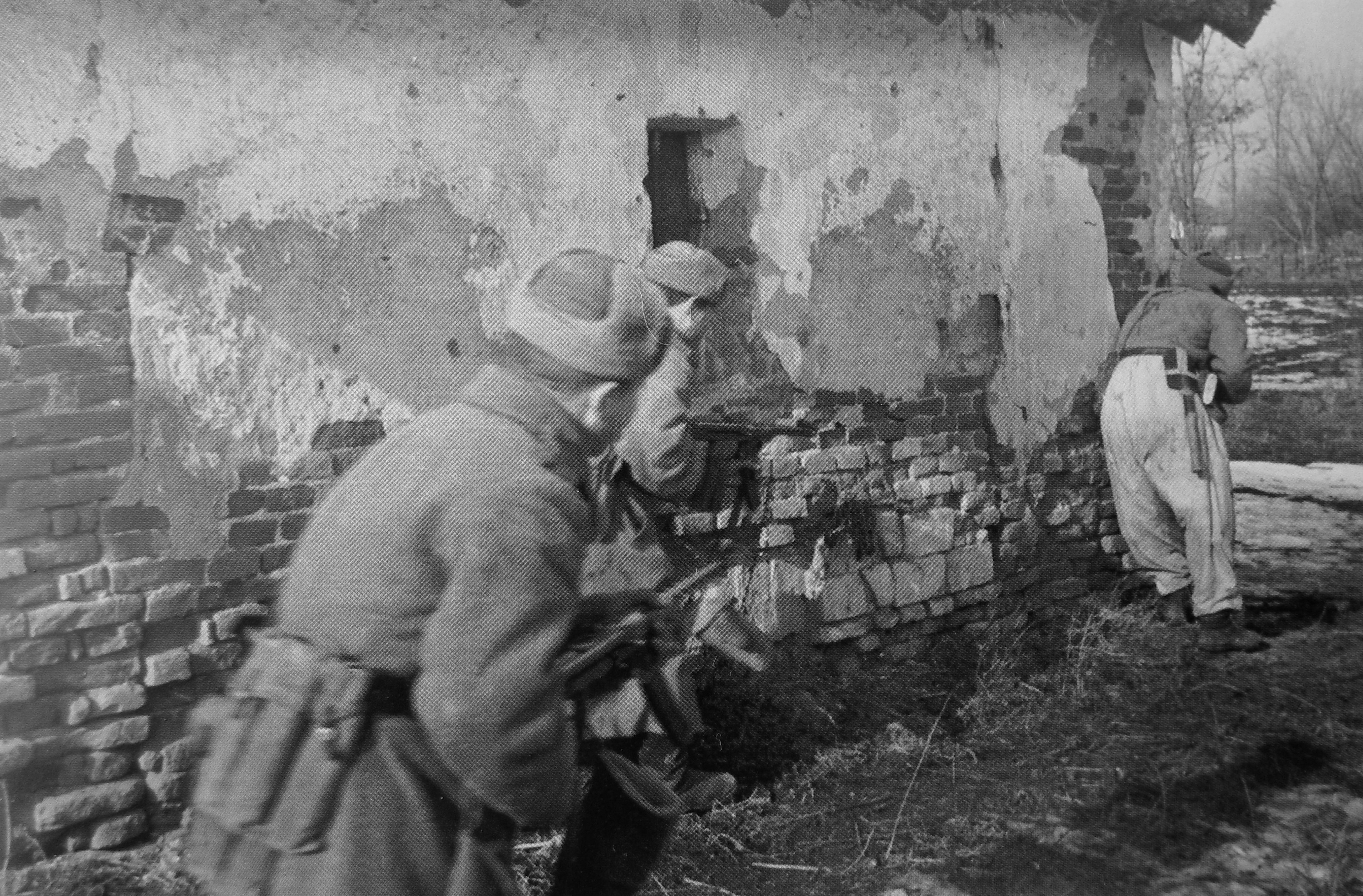 Автоматчики взвода под командованием младшего лейтенанта В. Серова 242-го стрелкового полка 104-й стрелковой дивизии 133-го стрелкового корпуса 26-й армии 3-го Украинского фронта ведут бой в венгерском населенном пункте.