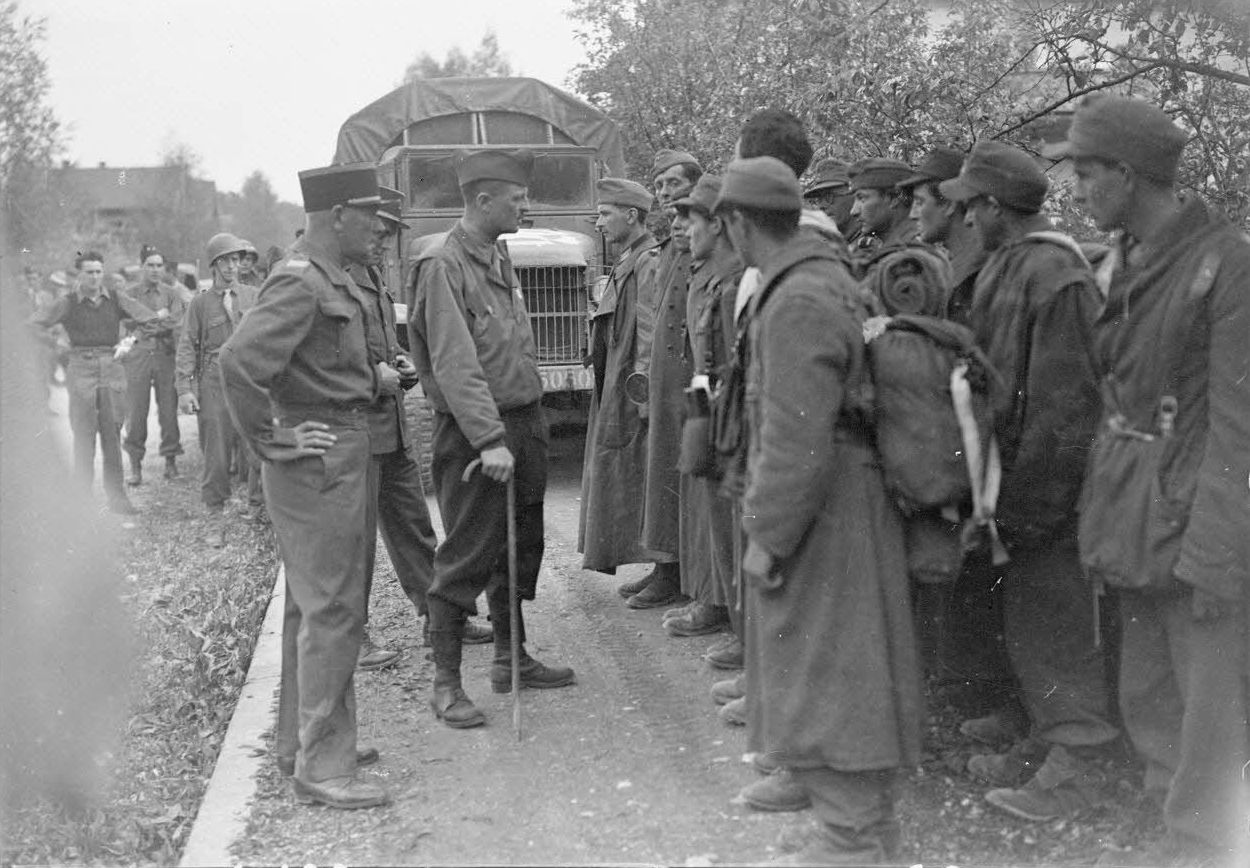 Пленные французы из частей СС перед генералом Леклерком (Philippe François Marie Leclerc de Hauteclocque, 1902-1947), командиром 2-й бронетанковой дивизии «Свободной Франции» (2e division blindée, 2e DB).