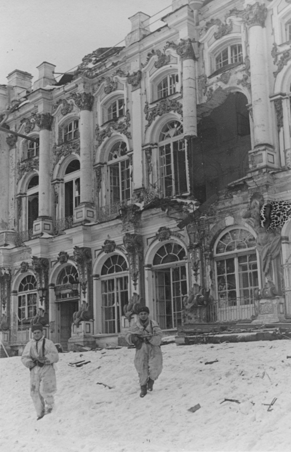 Автоматчики советской 42-й армии у Большого Екатерининского дворца в освобожденном Пушкине (Ленинградская область).