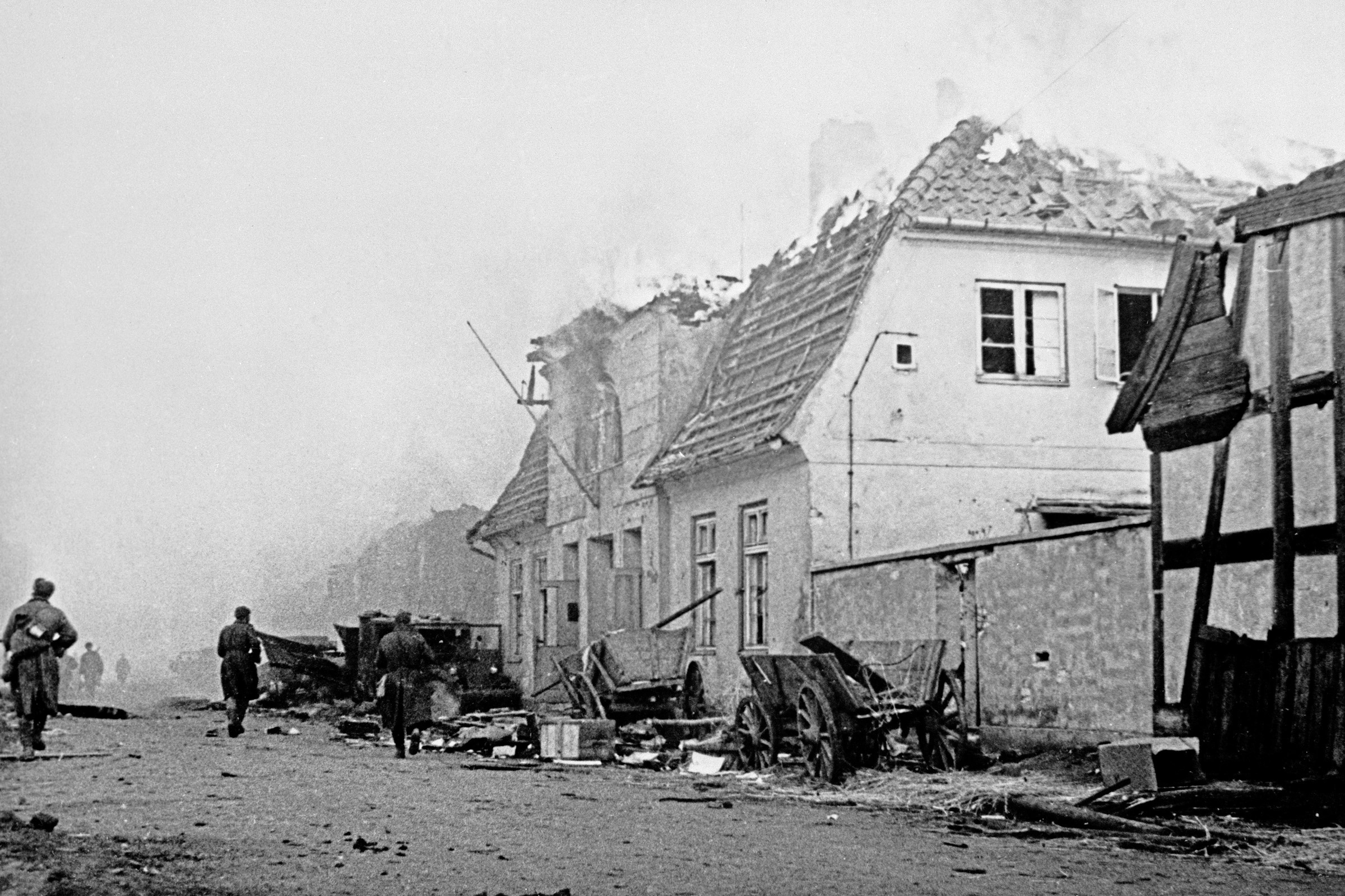 Красноармейцы бегут по улице во время наступления в Кенигсберге.
