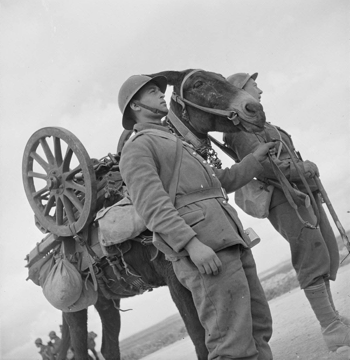 Французские артиллеристы с мулом, навьюченным горной пушкой, в Тунисе