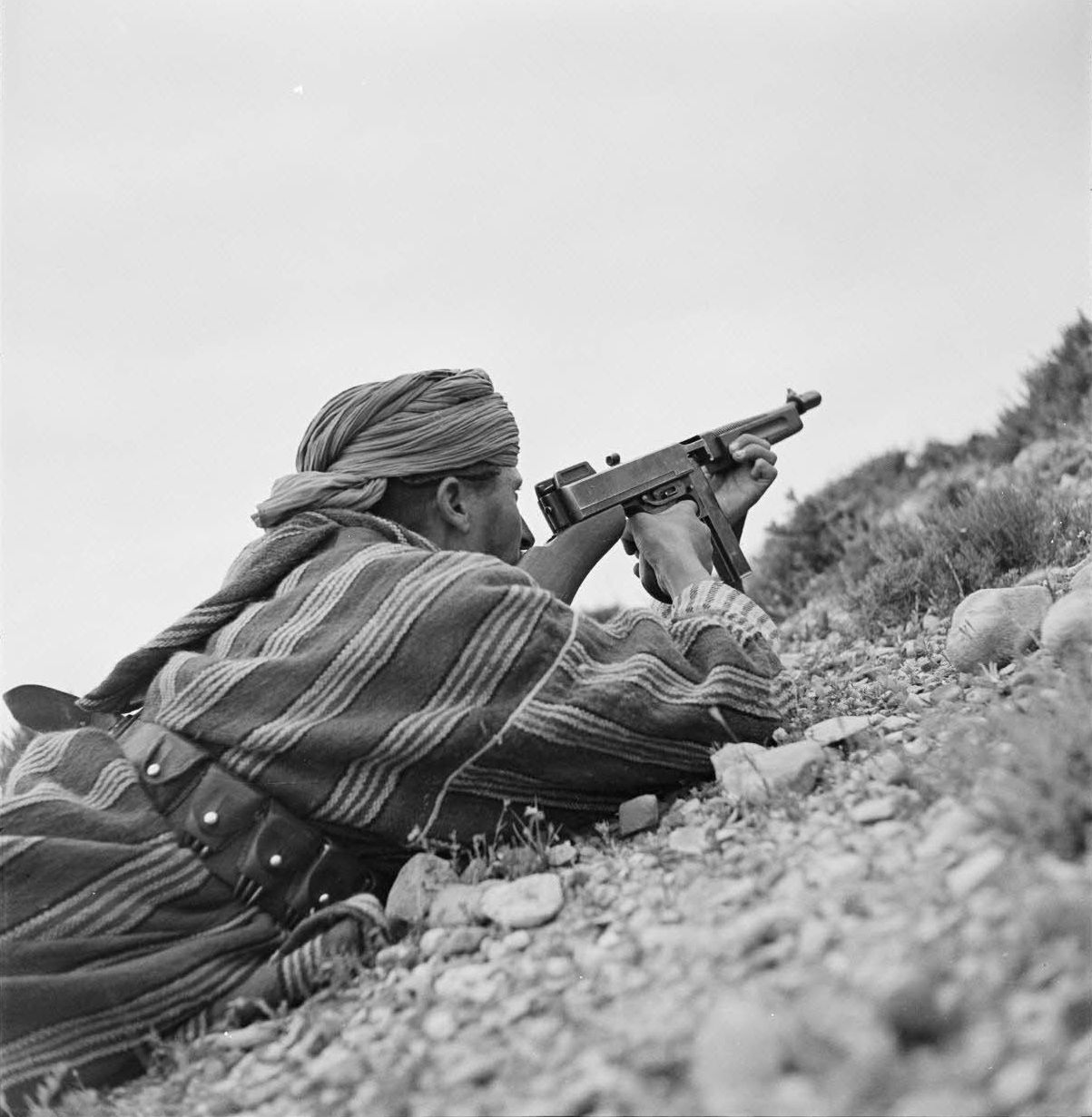 Французский солдат-гумьер из 2-й группы марокканских таборов 1-й марокканской маршевой дивизии (2e groupe de tabors marocains, 2e GTM; 1re division de marche du Maroc, 1re DMM) стреляет из пистолета-пулемета Thompson 1928A1 (американского производства) на посту в районе Уэсласьи (Oueslatia / الوسلاتية).
