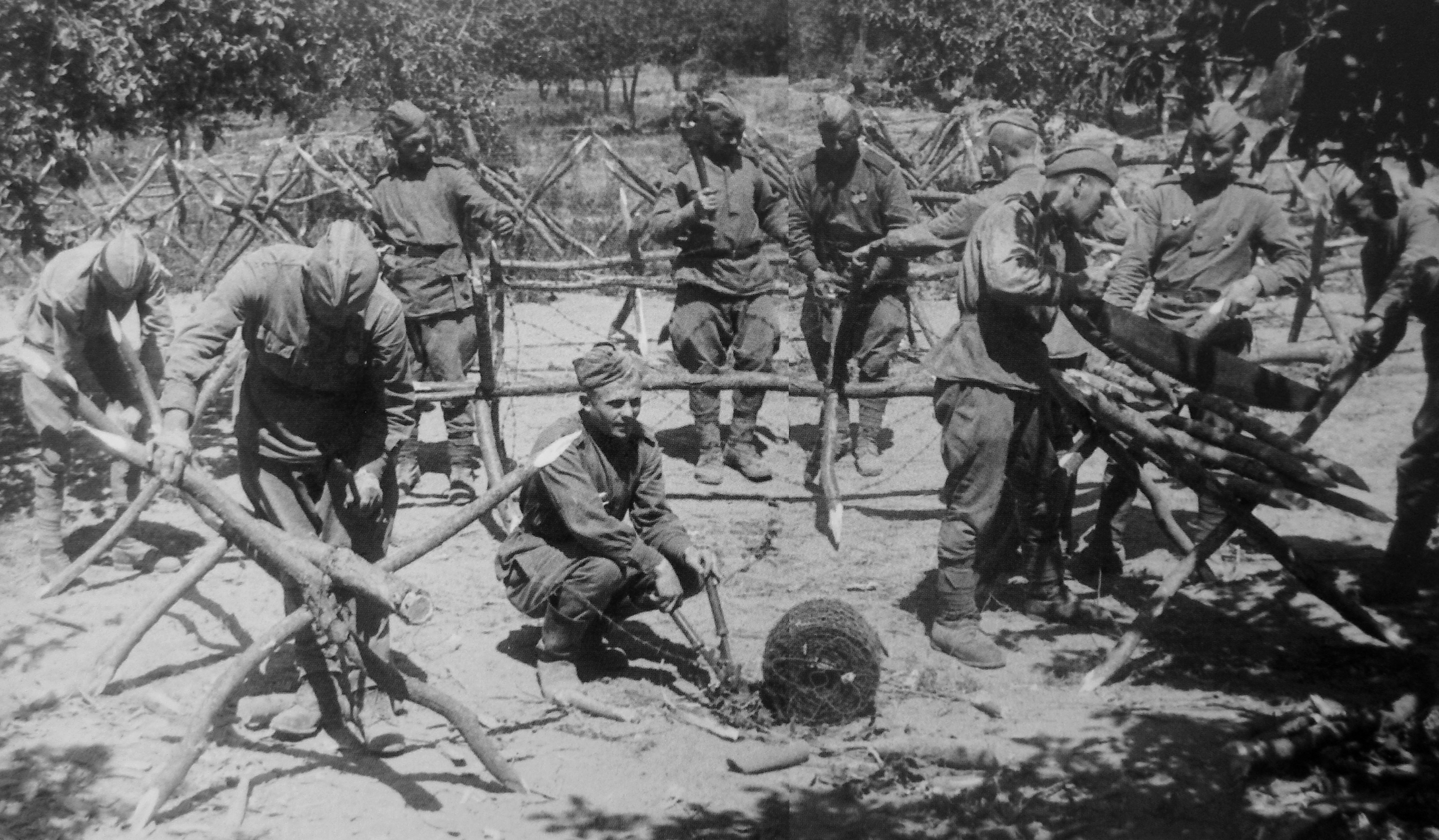 Бойцы саперной роты 185-го гвардейского стрелкового полка 60-й гвардейской стрелковой дивизии 32-го стрелкового корпуса 5-й ударной армии 3-го Украинского фронта изготавливают переносные проволочные заграждения-«рогатки».