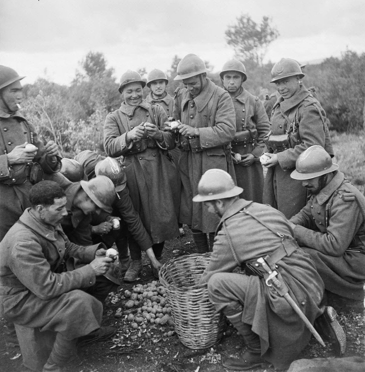 Французские солдаты из 7-го алжирского тиральерского полка (7e régiment de tirailleurs algériens, 7e RTA) чистят картошку в лагере районе Мактара (Makthar / مَكْثَر).