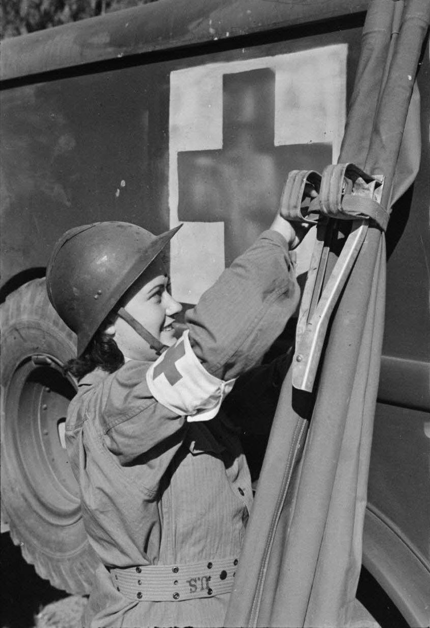 Французская женщина-водитель 531-й автосанитарной роты (531e compagnie sanitaire de transport) готовит носилки на базе в Риволи (Rivoli; совр. Асси-Мамеш / Hassi Mameche / حاسي مماش).