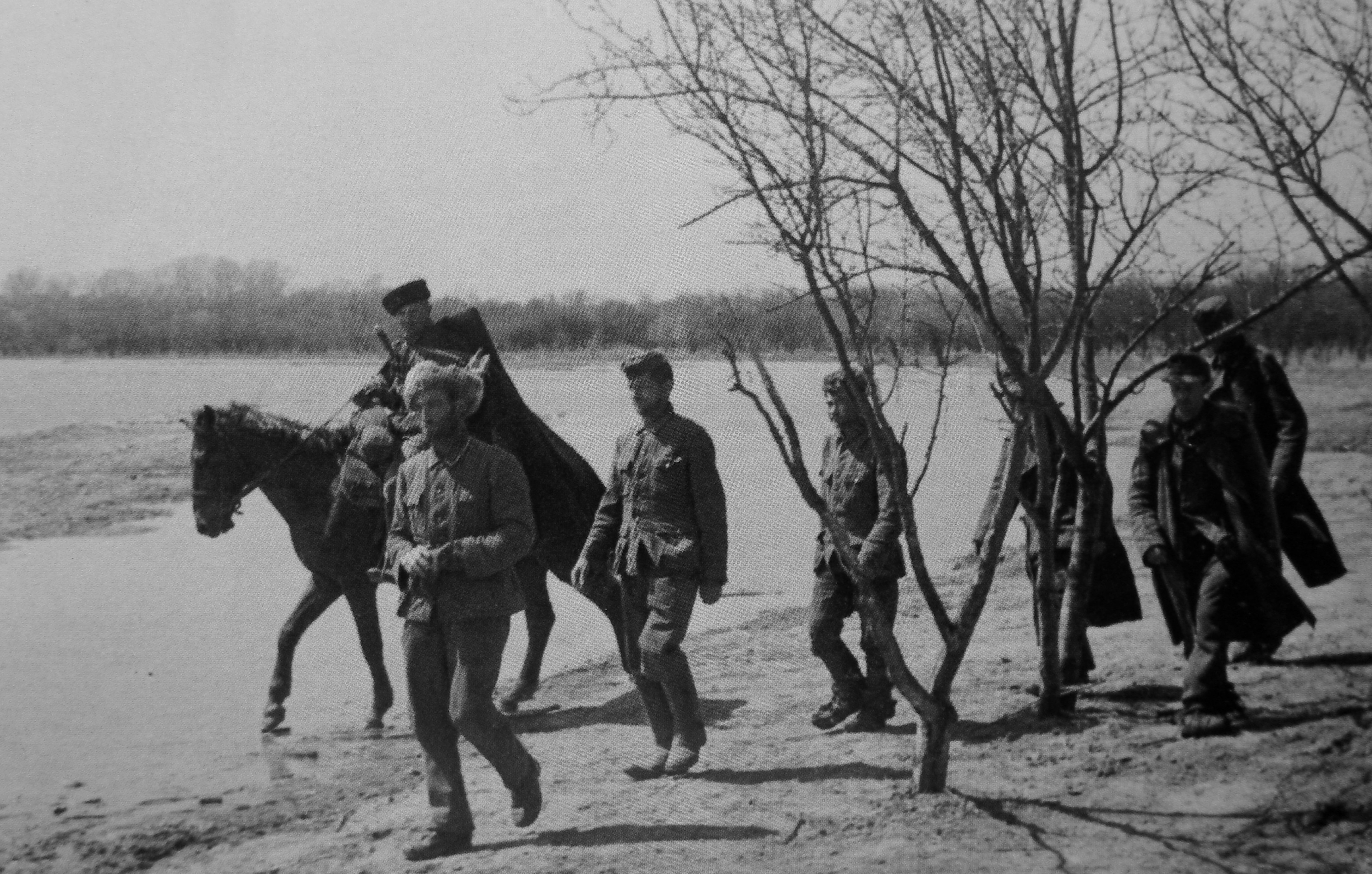 Разведчик взвода разведки 30-й кавалерийской дивизии 4-го гвардейского Кубанского казачьего кавалерийского корпуса 3-го Украинского фронта красноармеец Иван Николаевич Моисеев (1915 г.р.) конвоирует немецких и румынских оккупантов, сдавшихся в плен во время боев за железнодорожную станцию Раздельная.