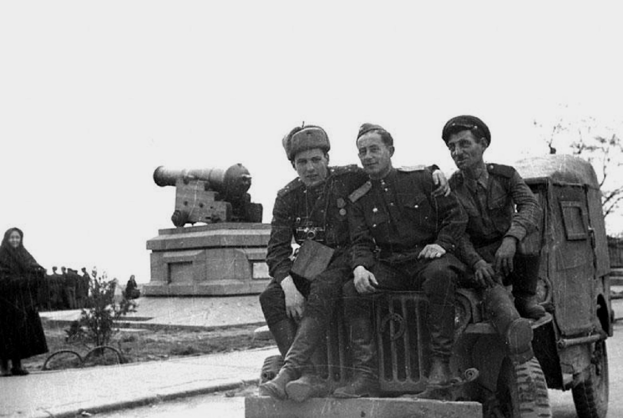 Фотокорреспондент газеты 6-й армии 3-го Украинского фронта «На разгром врага» старший лейтенант Дмитрий Николаевич Бальтерманц (1912 — 1990, слева) и специальный фотокорреспондент изданий Главного политического управления Красной армии инженер-капитан Марк Степанович Редькин (1908 — 1987, в центре) на капоте автомобиля Willys на Приморском бульваре освобожденной Одессы.
