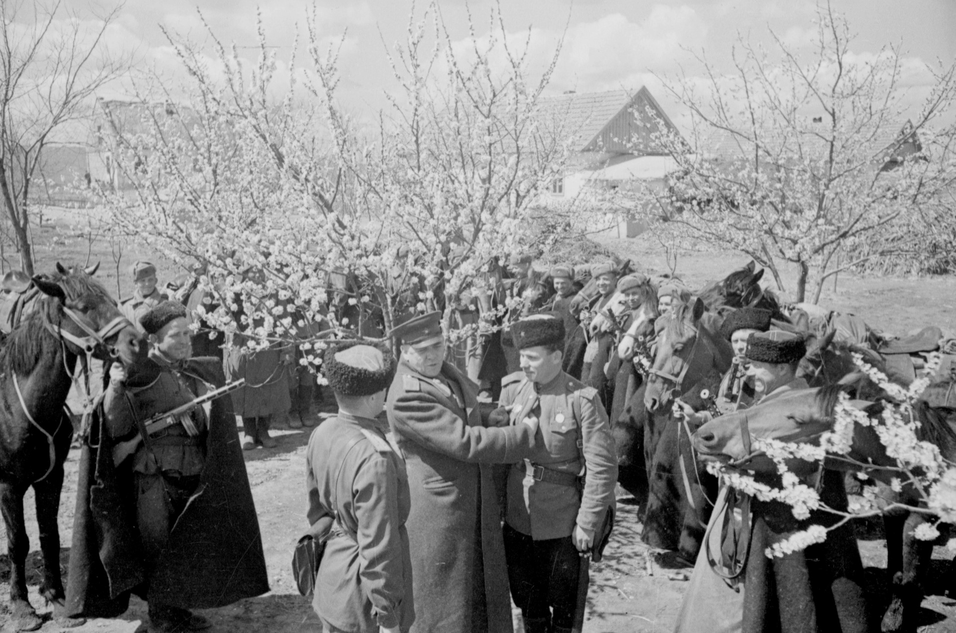 Командир 30-й кавалерийской дивизии 4-го гвардейского Кубанского казачьего кавалерийского корпуса 3-го Украинского фронта генерал-майор Василий Сергеевич Головской (1895 — 1975) вручает орден Александра Невского командиру взвода разведки старшему лейтенанту Ивану Митрофановичу Разоренову (1912 г.р.), отличившемуся при преследовании отступающего противника в Запорожской области: своим взводом в конном строю атаковал отступающую группу противника количеством 200 человек, взяв в плен 180 из них.