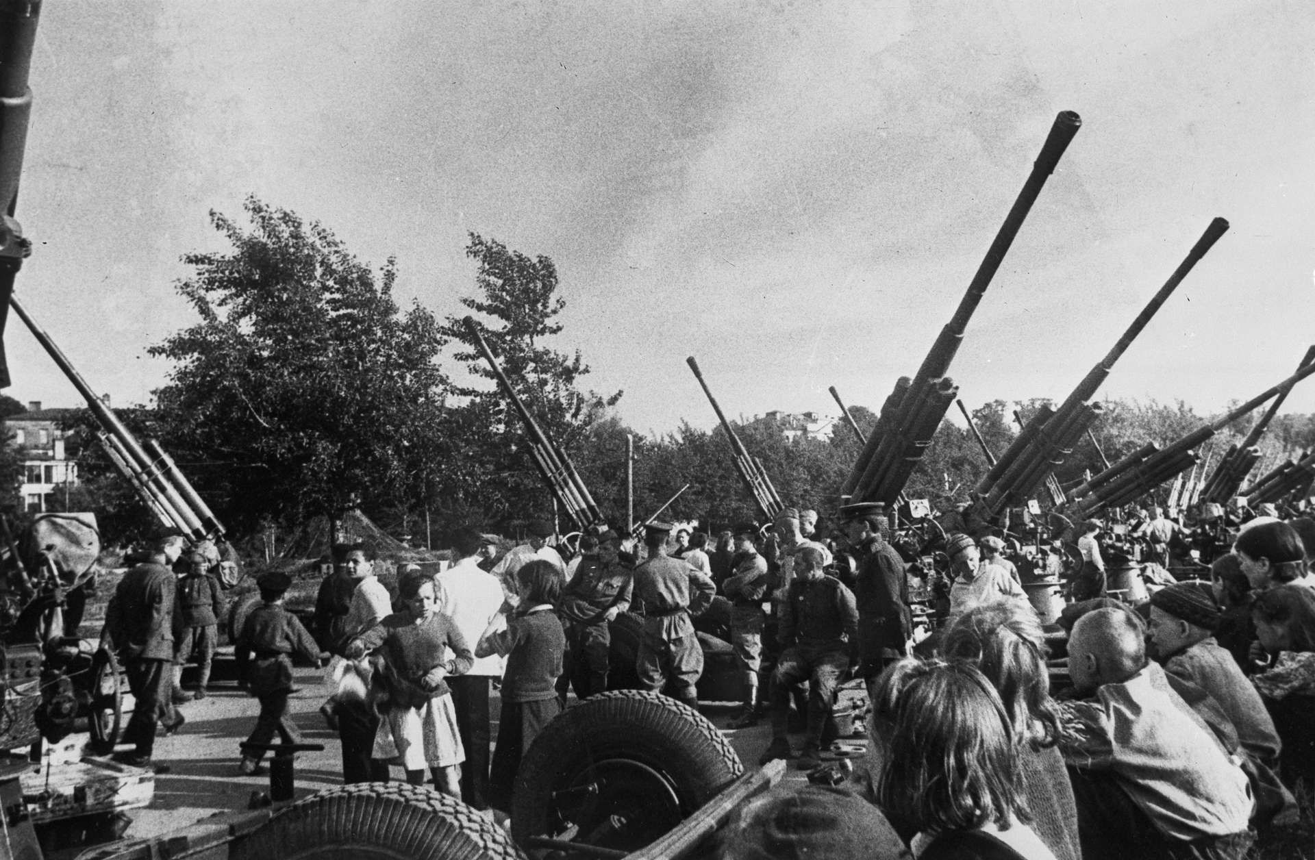 Горожане на ваставке Московской противовоздушной обороны в ЦПКИО им. Горького. На снимке советские 85-мм зенитные пушки 52-К образца 1939 года.