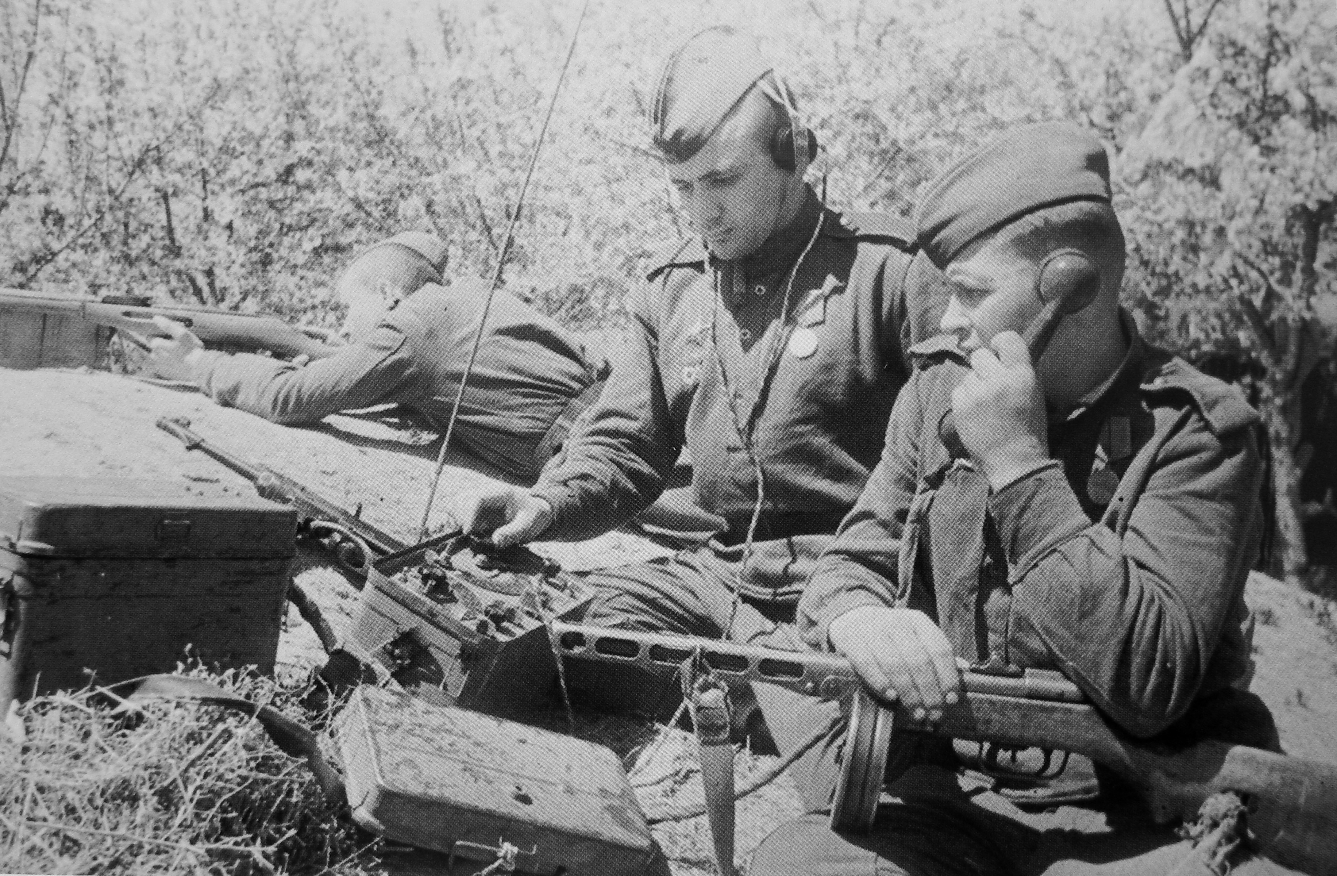 Начальник радиостанции роты управления 36-й гвардейской танковой бригады 4-го гвардейского механизированного корпуса 3-го Украинского фронта гвардии сержант Степан Иванович Бабиков (1921 г.р.) и радиотелеграфист старший гвардии ефрейтор Яков Захарович Стражнюк (1920 г.р.) работают на переносной приемно-передающей полудуплексной КВ-радиостанции РБ.