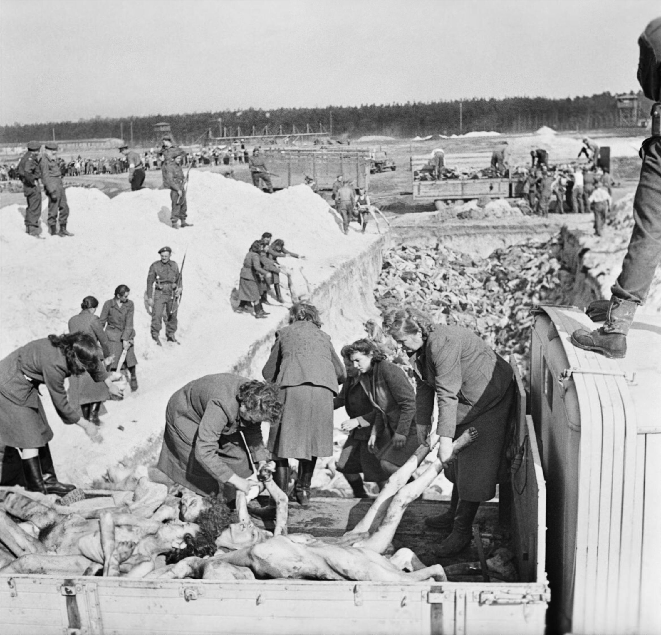 Женщины из охраны СС концлагеря Берген-Бельзен (Bergen-Belsen) разгружают трупы узников для захоронения в братской могиле. На эти работы их привлекли союзники, освободившие лагерь. Вокруг рва — конвой из английских солдат. Бывшим охранницам в качестве наказания запрещено пользоваться перчатками, чтобы подвергнуть их риску заражения тифом.