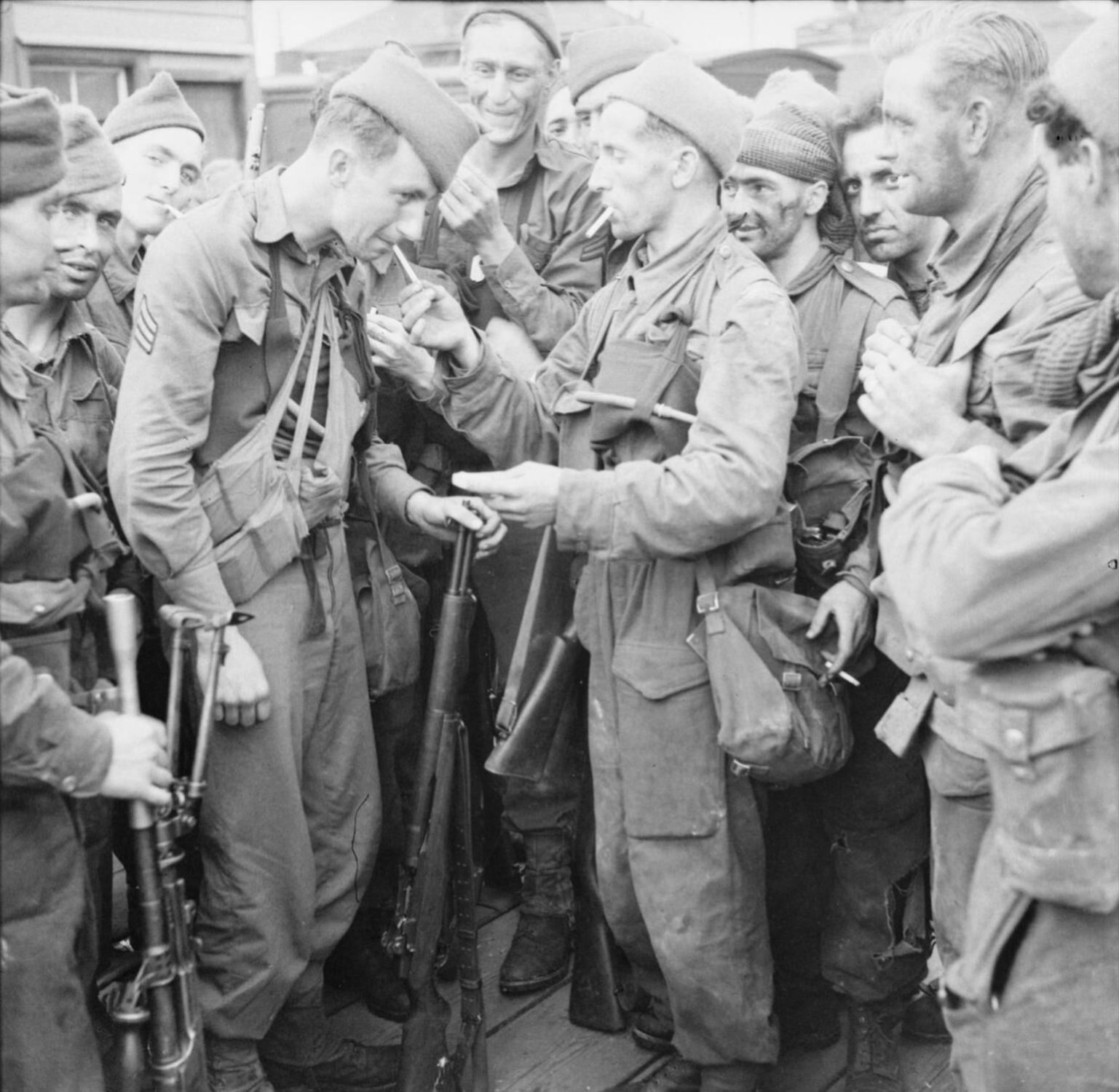 Британские коммандос и американские рейнджеры после возвращения из рейда на Дьепп. Это был первый случай во Второй Мировой войне, когда нога американского солдата вступила на землю европейского континента.