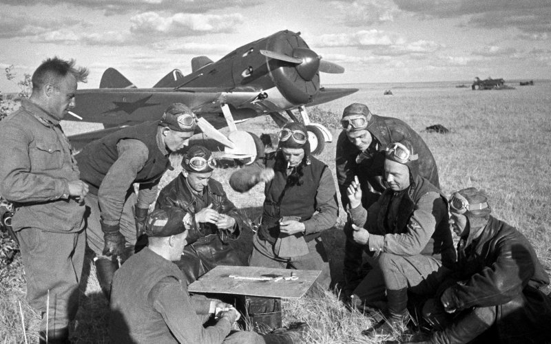 Советские авиаторы играют в домино у истребителя И-16 на монгольском аэродроме Тамсаг-Булак.