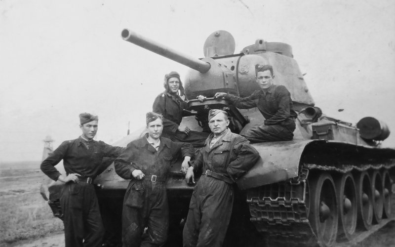 Советские танкисты — механик-водитель Евгений Евстафьевич Новиков (1925 — 2015) с боевыми товарищами — у танка Т-34 в районе Варшавы.