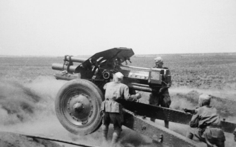 Расчет 122-мм гаубицы образца 1938 года (М-30) 2-го гвардейского механизированного корпуса 2-го Украинского фронта ведет огонь по врагу.