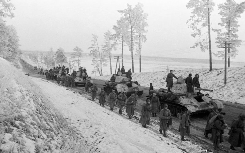 Колонна советских танков Т-34 и бойцы пехоты в наступлении на Украине.