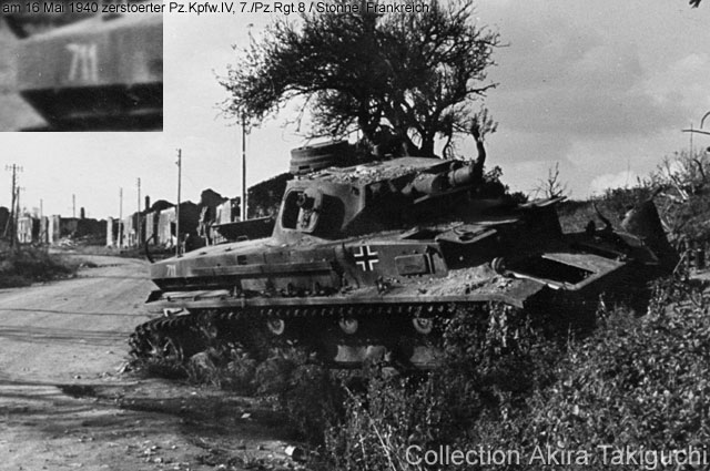 Многочисленные источники сообщают, что этот танк был подбит 15 мая 1940 в ходе боев за городок Стонн (Stonne)(снимок, видимо, был сделан на следующий день).Это танк с номером 711 7-ой роты 8-ого танкового полка 10-й танковой дивизии:
