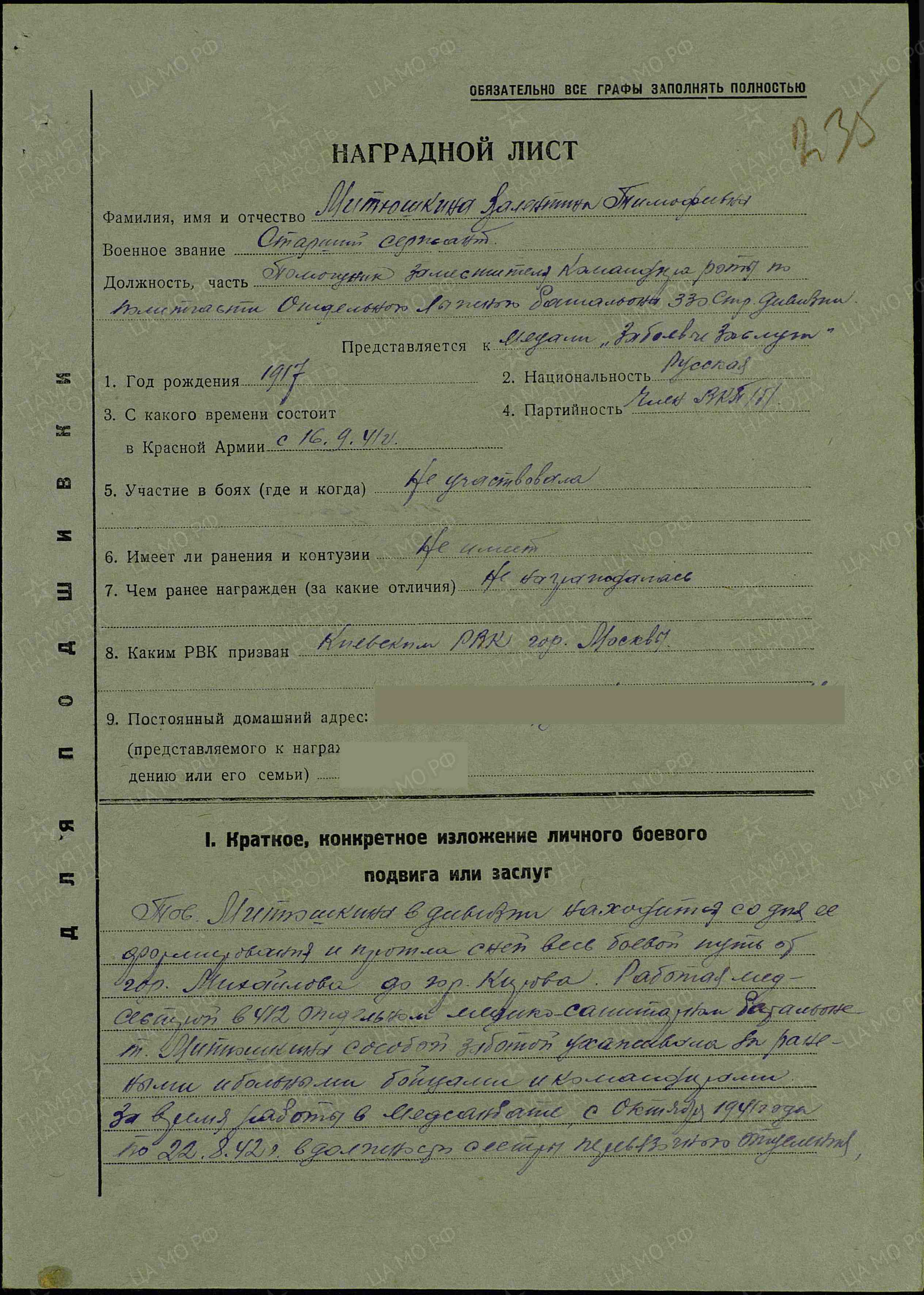 помощник заместителя командира роты по политической части отдельного лыжного батальона старший сержант Валентина Тимофеевна Митюшкина (1917 г.р.) - так определена её должность в соответствии с наградным документом