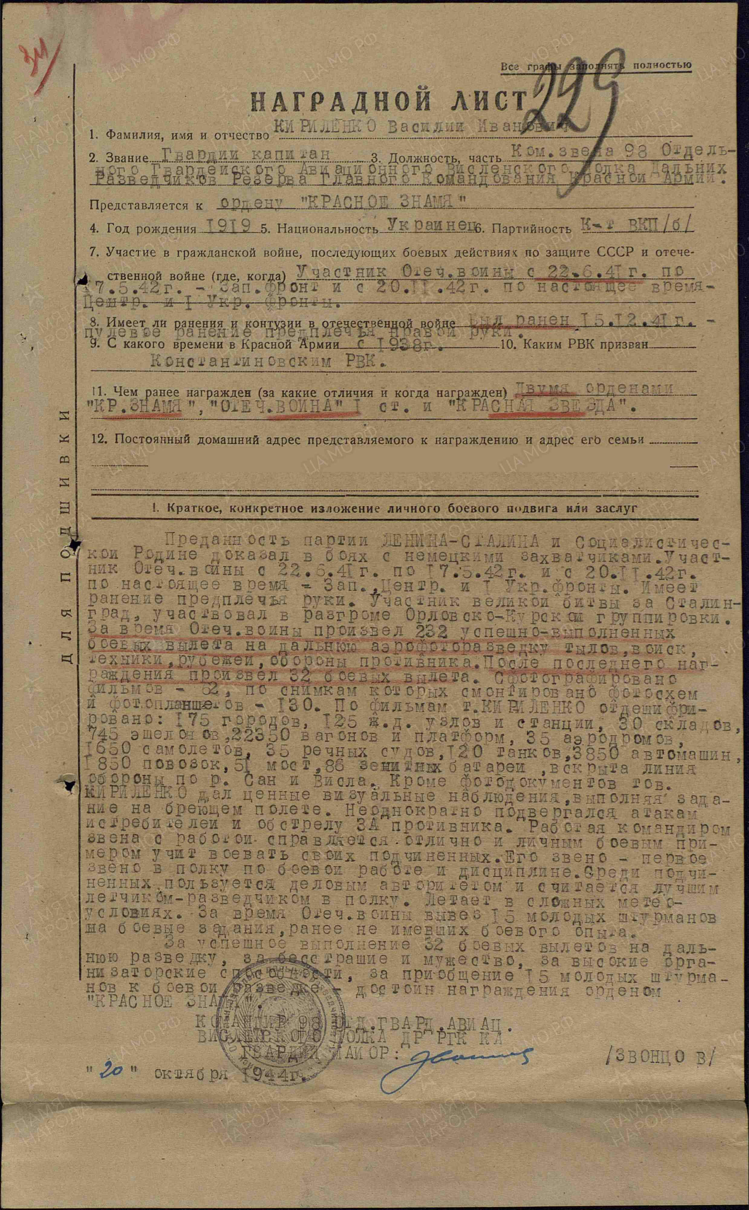 На [color=brown]старшего лейтенанта [/color]Кириленко писалось представление на ГСС , а звание 26 октября 1944 года получил капитан