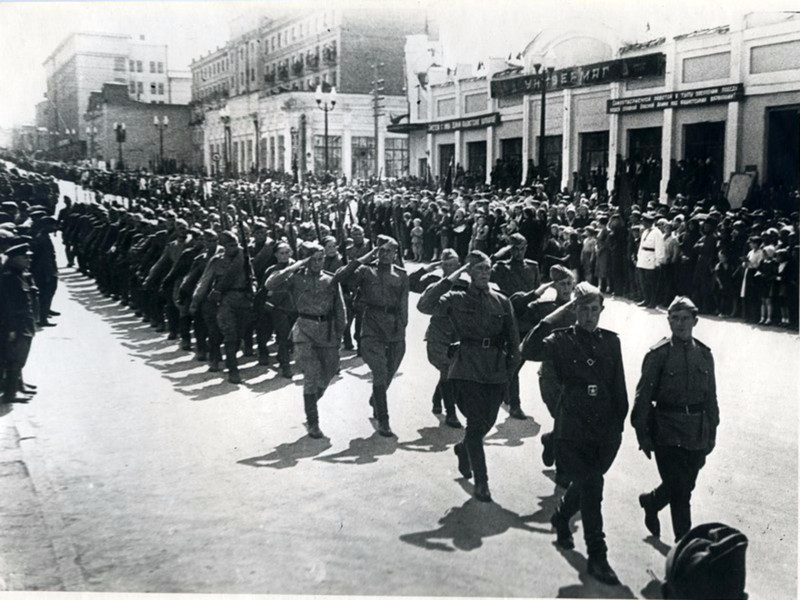 на фото https://waralbum.ru/318518/ колонна движется по ул.Кирова в сторону жд вокзала. Современный вид будет такой. Для наглядности добавил картинку-сопостовление "тогда и сейчас" с адресами и еще одно более качественное фото места с того же ракурса. Источник1. Источник2.