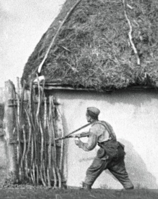 С гранатой РПГ-40 помкомандира взвода Бережной Александр Антонович 1913 г. р., на правом боку, на ремне у него — полевая сумка.