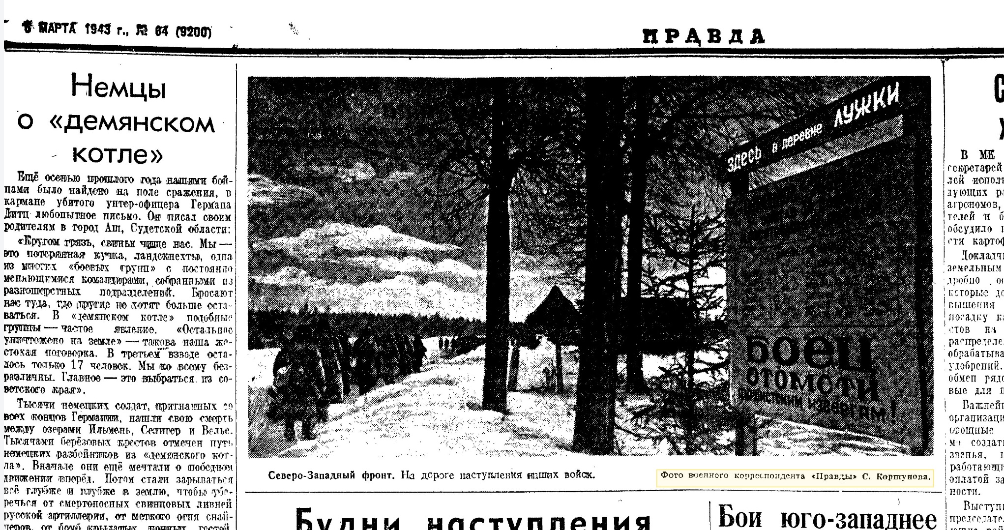 https://waralbum.ru/43926/ На РИА Новости автором фото значится Сергей Коршунов https://riamediabank.ru/media/1094.html?query=+%D0%B2+%D0%B4%D0%B5%D1%80%D0%B5%D0%B2%D0%BD%D0%B5+%D0%9B%D1%83%D0%B6%D0%BA%D0%B8&selection=media&sort=date&order=desc&context=search&cs=EOB-MjAjfnyeUp17SUChTw   Он же значится автором другого фото с этим же плакатом в газете Правда от 6 марта 1943 года https://yandex.ru/archive/catalog/a8ad9362-e442-47d5-a953-ffbcd1731794/3?center=2761+1730 За место съемки ничего не скажу т.к. в обсуждениях упоминают Новгородскую область, а не Ленинградскую как у РИА