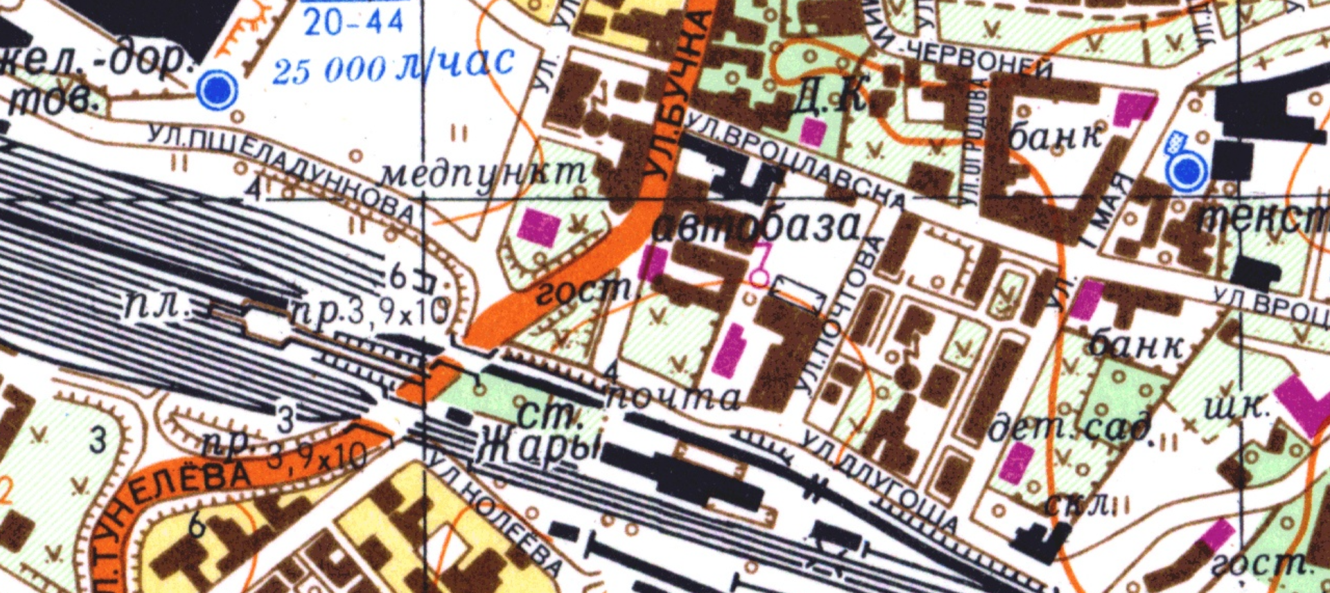 Оранжевым цветом выделена Тунелева (Tunelowa) улица, выходящая из под жд моста и переходящая в улицу Бучка (Buczka). Сейчас это улица Śródmiejska. Отель, из которого сделан снимок, помечен фиолетовым прямоугольником выше и правее слова "гост". Современный адрес - Śródmiejska, 15.