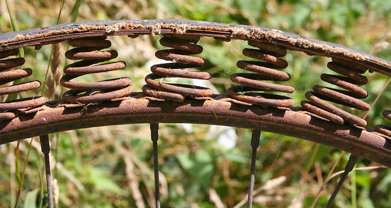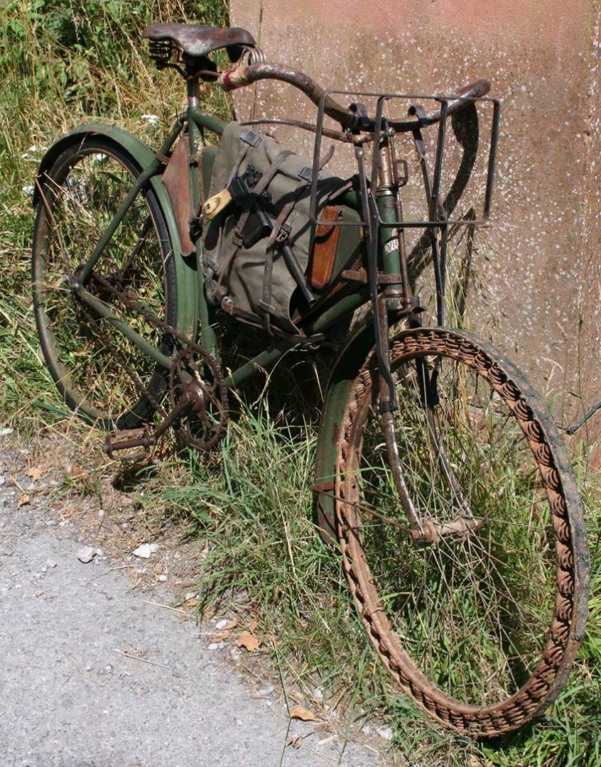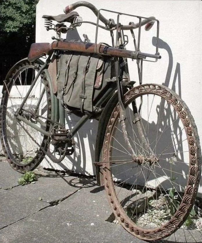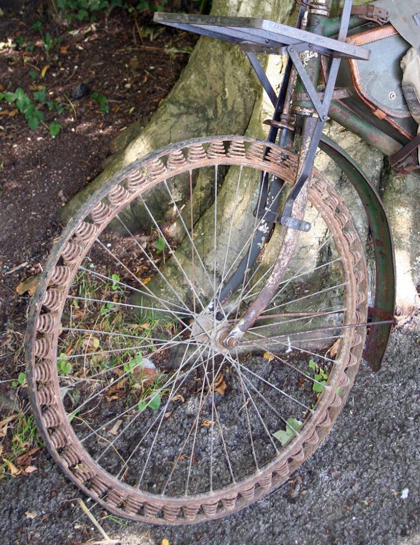 В годы Первой мировой войны резина, вполне ожидаемо, стала дефицитным товаром, тут конечно и начались поиски ее замены. Так и появилась вот такая необычная шина. В данном случае она стоит на немецком велосипеде Herrenrad Victoria Model 12 (1905 года), который применялся во время ПМВ. Впрочем, сильно далеко данное изобретение не пошло. Да, и проблему с дефицитным каучуком позднее решили.