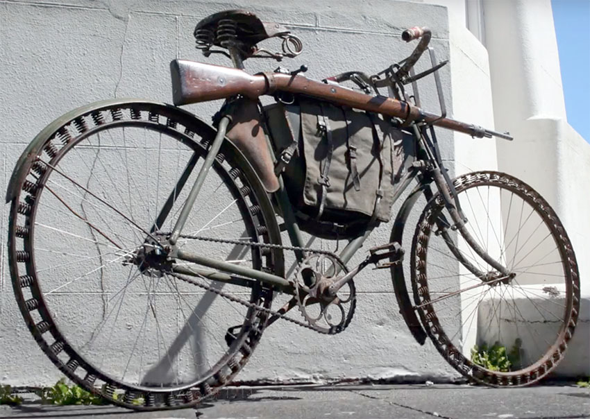С 1912 года на вооружении итальянской армии стоял довольно неплохой складной велосипед Bianchi Model 1912 military cycle. Прикрутили винтовку, пару переметных сумок и покатили. Хорошо. Но вот вопрос: а как быть с пулеметами? И пулемет интегрировали в велосипед. Правда, с устойчивостью лафета пришлось повозиться: велосипед, как вы знаете, сам по себе падает. Однако, задачу решили как мне кажется, довольно красиво. Как? А вот видите такую штуку, которая вперед торчит? Так вот, это стремя-упор.